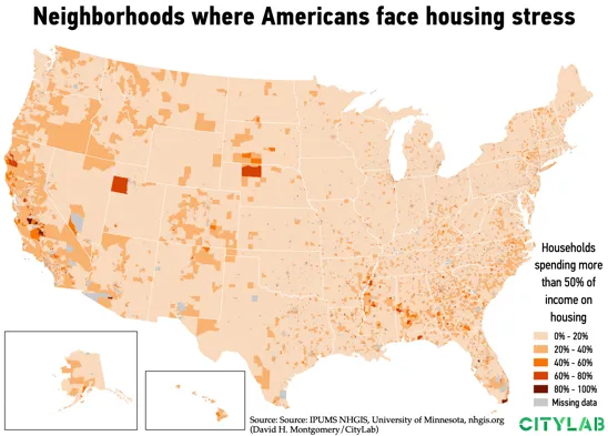 超过10%的美国家庭将至少一半的总收入用于住房费用——远远超过金融专家建议的三分之一的最大限度。根据CityLab对美国人口普查数据的分析,这些严重负担住房的家庭可能是富有或贫穷的,但大约一半的家庭位于至少有三分之一邻居面临类似住房负担的社区。国家历史地理信息系统。
