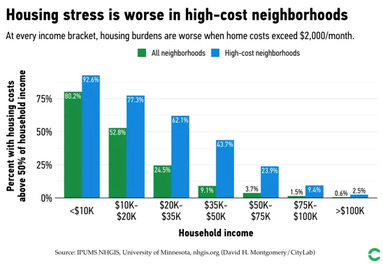 在极端情况下,这会导致即使是富裕家庭也难以支付住房费用。总体而言,年收入至少为50,000美元的家庭中,只有一小部分面临严重的住房负担,而几乎没有收入超过100,000美元的人将一半的收入用于租金或抵押贷款。但在最高成本的地区,尤其是在加利福尼亚州和纽约市大都会区,有许多社区中,中等甚至高收入家庭也在为住房费用而苦苦挣扎。