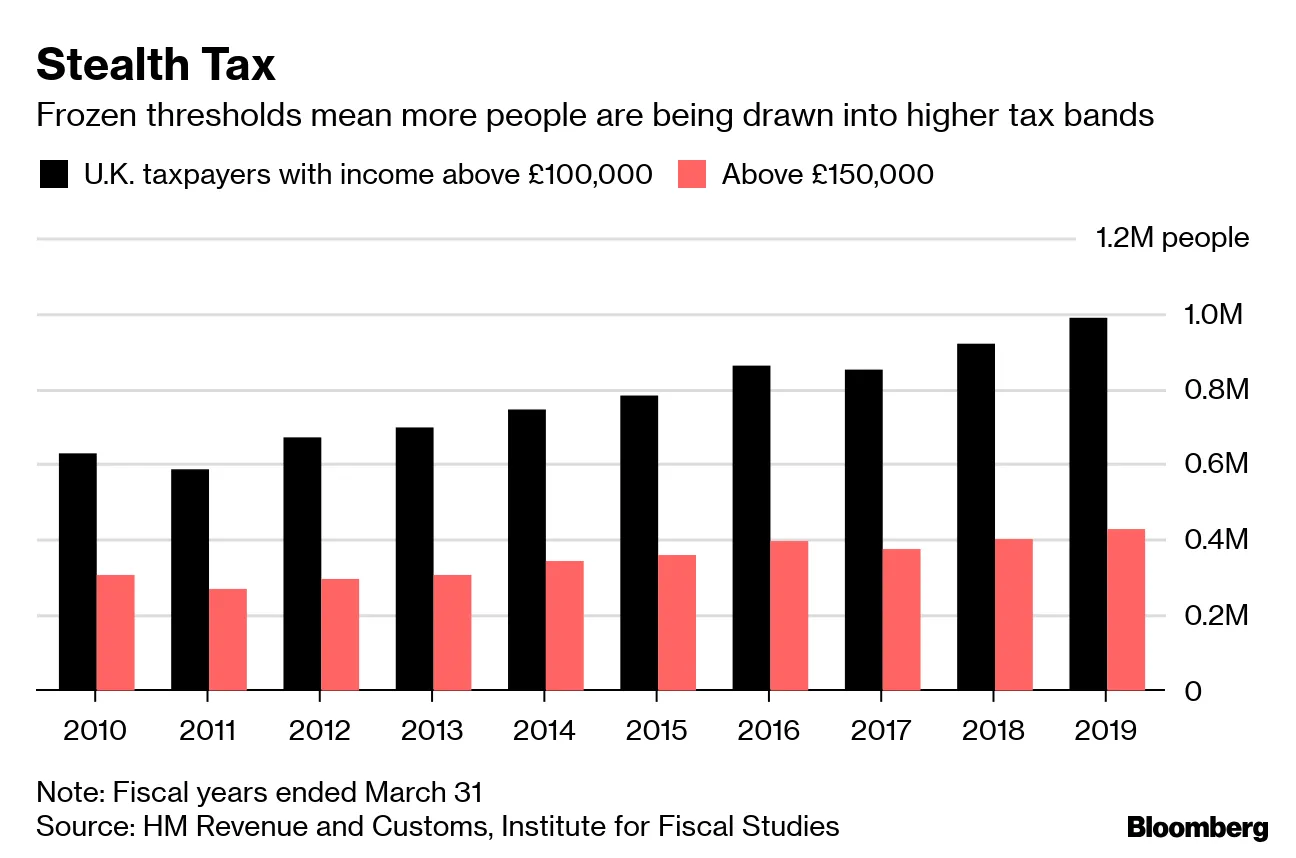 收入较高的英国工人是有害的“隐形”税收增加的受害者,根据财政研究所的说法。该智库表示,决定冻结门槛而不是根据通货膨胀提高门槛意味着更多人被吸引到更高的税率区间。2008年,有319,000名纳税人收入超过最高所得税水平150,000英镑。现在,这一数字已达到428,000。