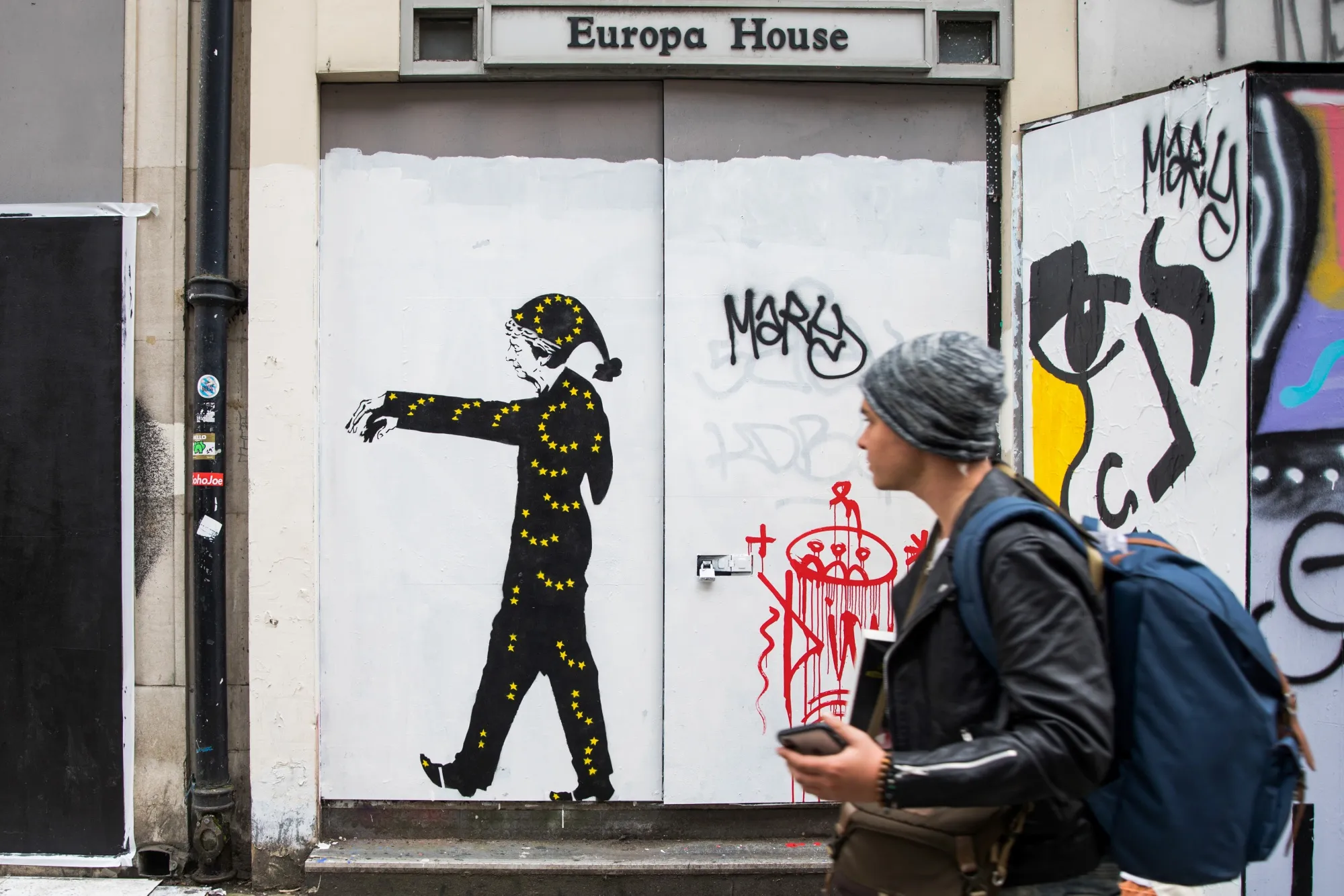 一名行人经过一幅涂鸦,涂鸦描绘了英国首相特蕾莎·梅在伦敦市中心梦游,穿着带有欧盟(EU)旗帜星星的睡衣,时间是2019年4月3日,星期三。梅预计将在星期三与反对派工党领袖杰里米·科尔宾会面,试图达成一项脱欧妥协,这可能意味着与欧盟保持更紧密的联系。摄影师:克里斯·拉特克利夫/彭博社摄影师:克里斯·拉特克利夫/彭博社