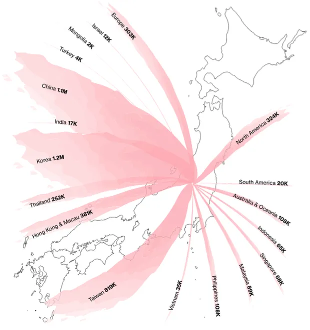樱花的巨大商业。 估计有6300万人前往日本及其境内观赏每年的樱花, 花费约27亿美元。他们来自哪里呢。