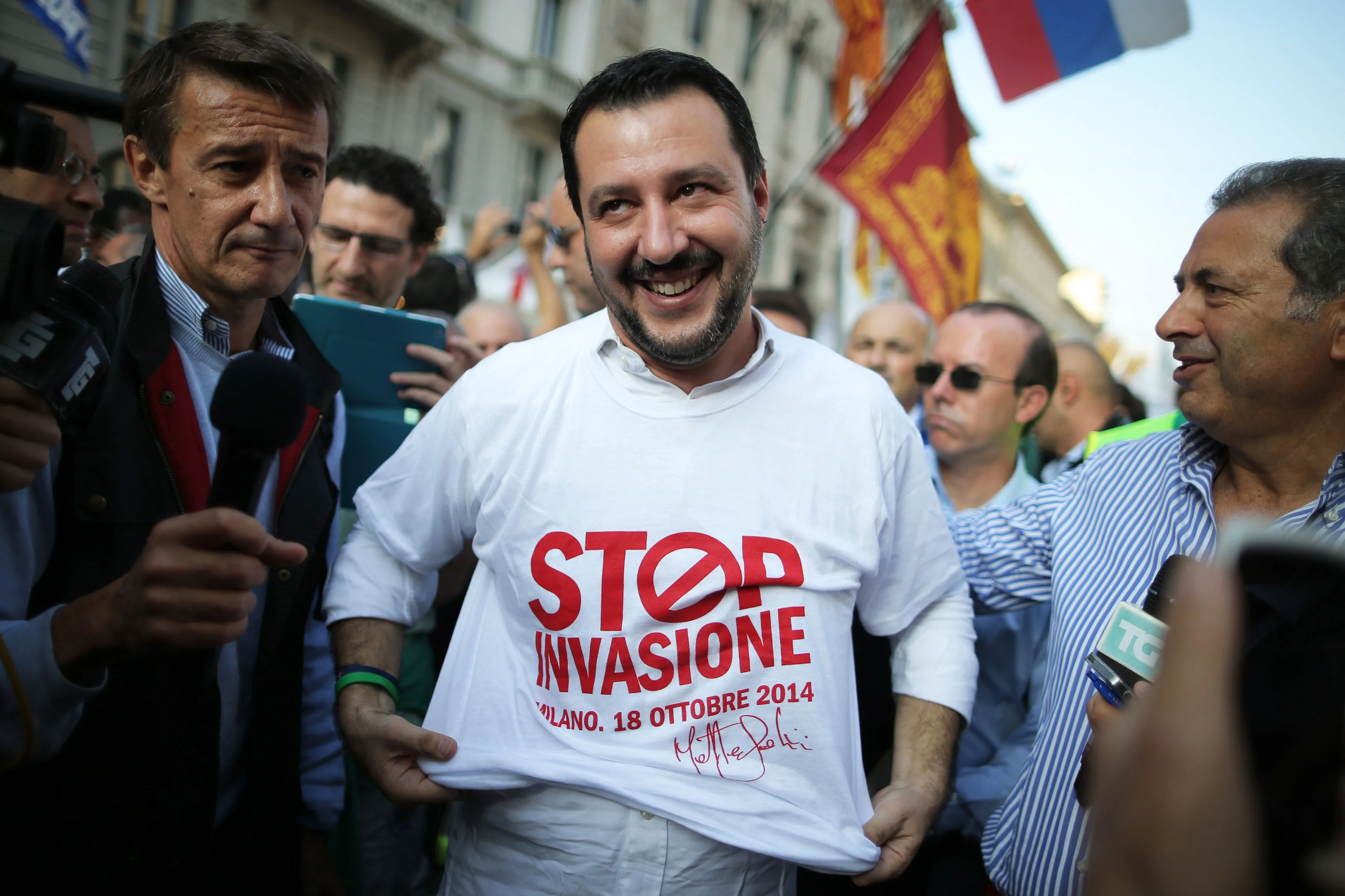马泰奥·萨尔维尼在2014年米兰的一次反移民示威中穿着印有“停止入侵”的T恤。摄影师:马尔科·贝尔托雷洛/法新社通过Getty Images萨尔维尼在2013年底接任北方联盟的领导人,当时该党在2月份的选举中滑落至4%的支持率,党内一片混乱。创始人翁贝托·博西因腐败丑闻在前一年辞职,他的继任者们一直在努力稳住局面。