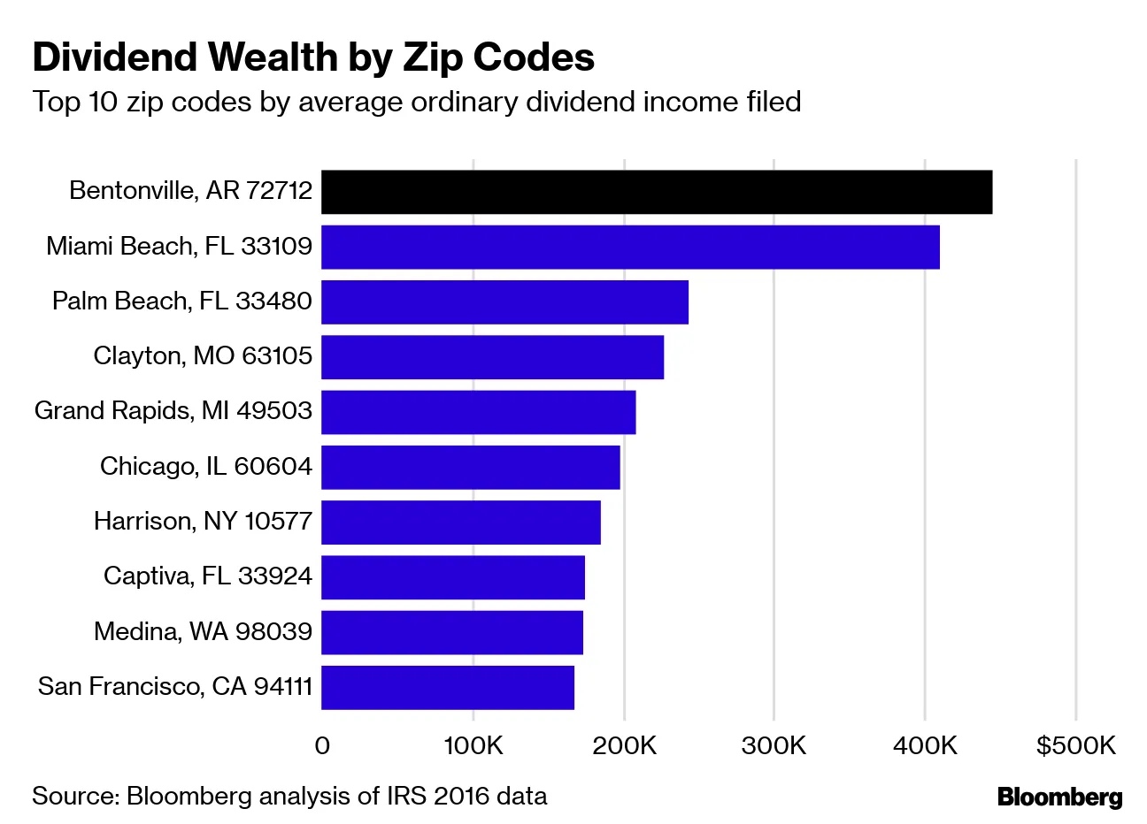 在美国最高收入地区的名单上,有一个意想不到的城镇。在对人均普通股息最高的邮政编码的排名中,阿肯色州本顿维尔,沃尔玛的故乡,以2016年446,000美元的收入位居榜首——远高于迈阿密的亚军,根据我们的分析。这里是沃尔顿企业和沃尔顿家族基金会的所在地,后者拥有沃尔玛约一半的股份。