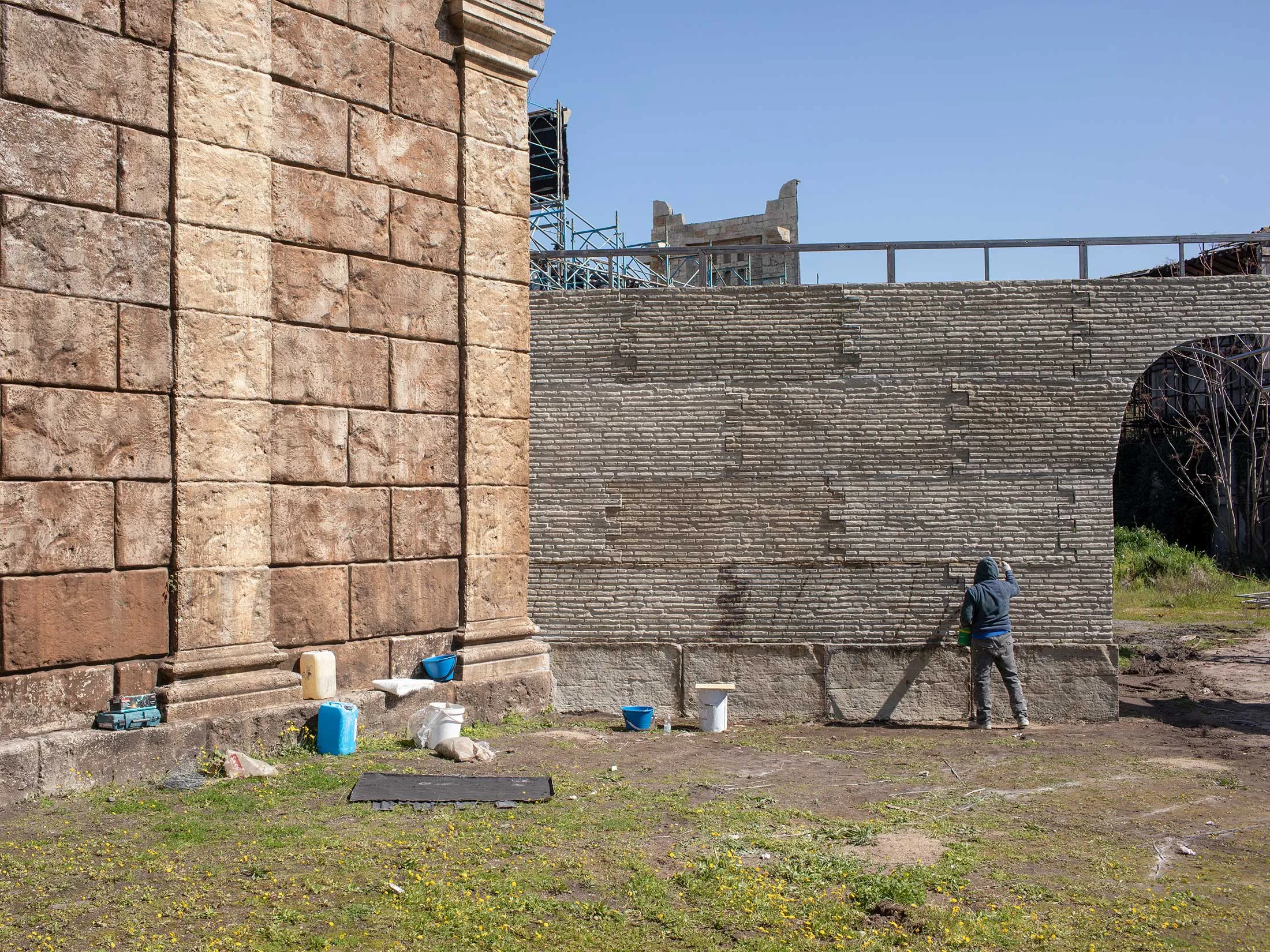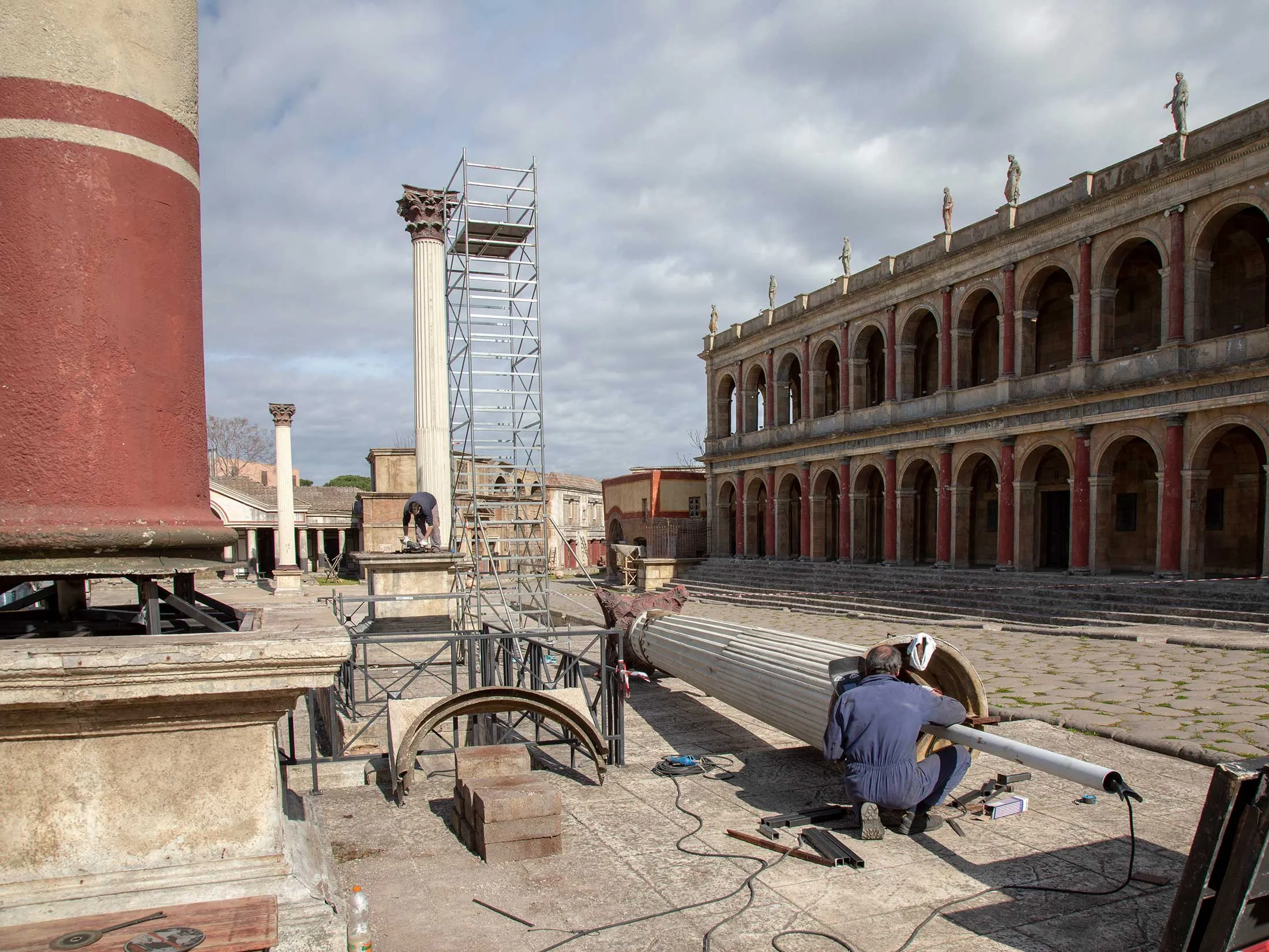 帝国罗马布景上的一根柱子的维护。摄影师:Rocco Rorandelli/TerraProject这个99英亩的设施还包括为安东尼·明格拉的 英国病人、马丁·斯科塞斯的 纽约黑帮,以及弗朗西斯·福特·科波拉的 教父:第三部 提供背景的摄影棚。最近,帝国罗马的中央广场的复制品被用于HBO迷你剧 罗马,以及BBC的 神秘博士 的一集。保罗·索伦蒂诺的迷你剧 年轻的教皇 很大一部分是在Cinecittà拍摄的,使用了梵蒂冈的复制品和西斯廷礼拜堂的全尺寸复制品。