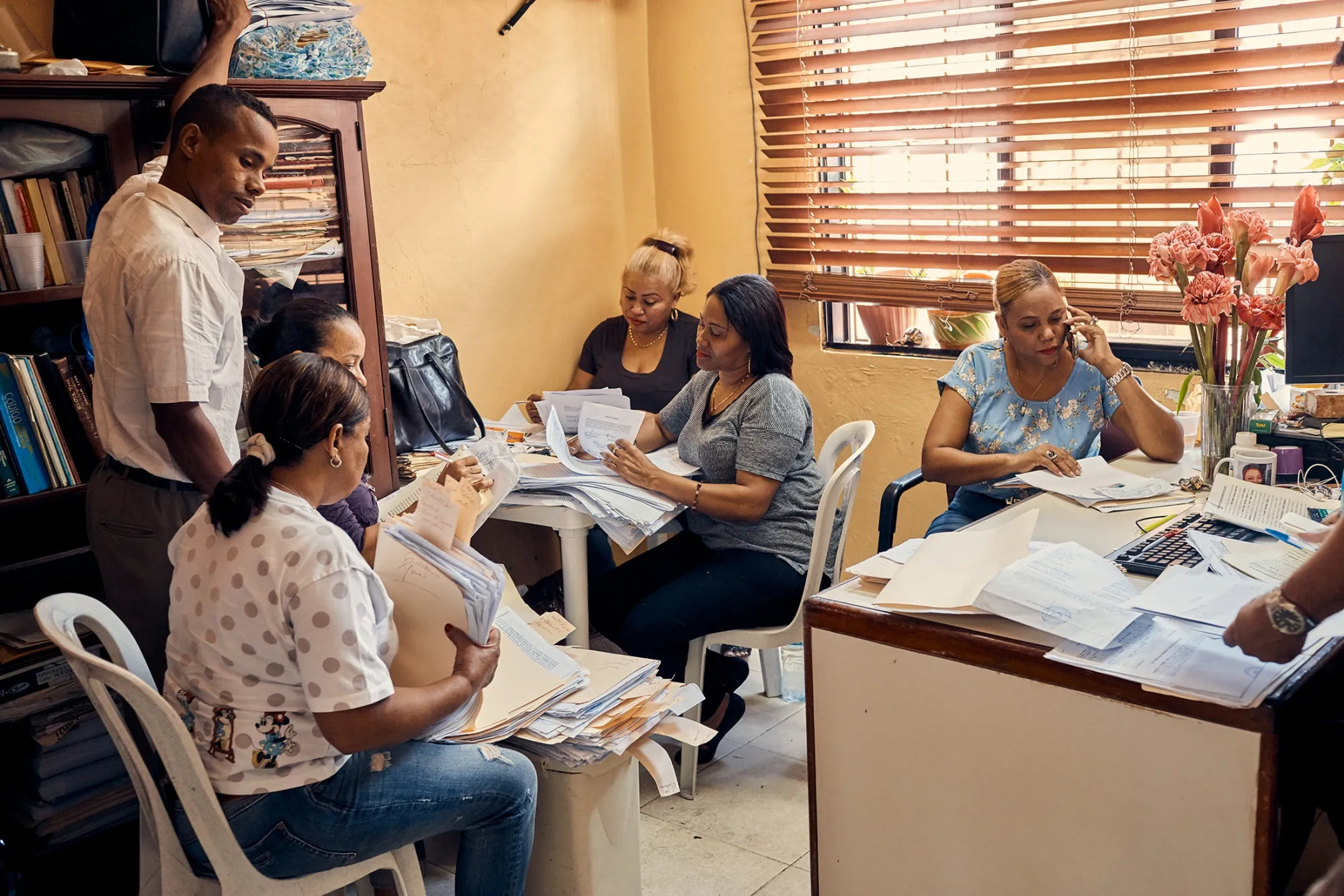 当我给出租车司机看地址时,他感到惊讶,那是圣多明各一个粗犷而动荡的街区,游客们很少敢冒险前往。狭窄的街道上满是垃圾,露天商店前的人行道上挤满了纹身的男人。那里的几栋较大的建筑物满是灰尘,显然被遗弃,只有一栋例外。出租车把我放下的三层建筑充满了活力,热闹非凡。门前的招牌写着:“法律中心”。一群人站在通往二楼的楼梯前,周围徘徊着几十个人。当我到达二楼时,看到那里的人员正在填写一些文件,然后递给柜台后的顾问。