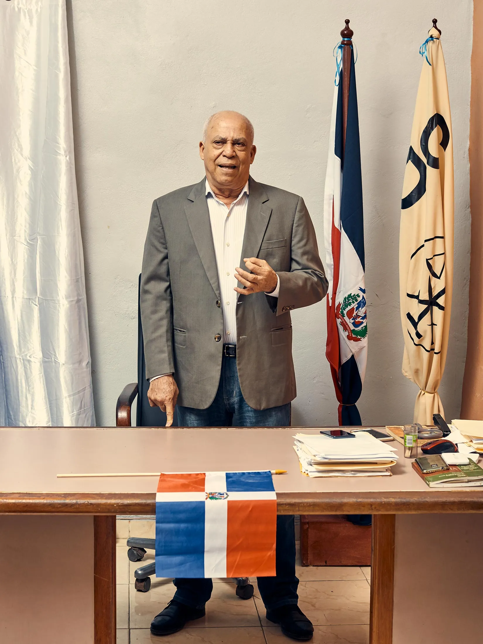波托雷亚尔在他的办公室里讲话。摄影:克里斯托弗·格雷戈里他就是波托雷亚尔。简直出类拔萃:穿着蓝色西装外套,紧身牛仔裤和乐福鞋。他看起来比65岁要年轻,几乎没有皱纹,头发剪得很短。他的微笑充满神秘感。最重要的是,他有一种存在感;在房间里,其他人都跟着他的节奏,笑他的笑话。当他说话时,大家都聚精会神地听着,当有什么事情激怒他时,他们表现出愤怒。他们称他为“博士”,是指他的法律学位,尽管很少有多米尼加律师使用这个称谓。