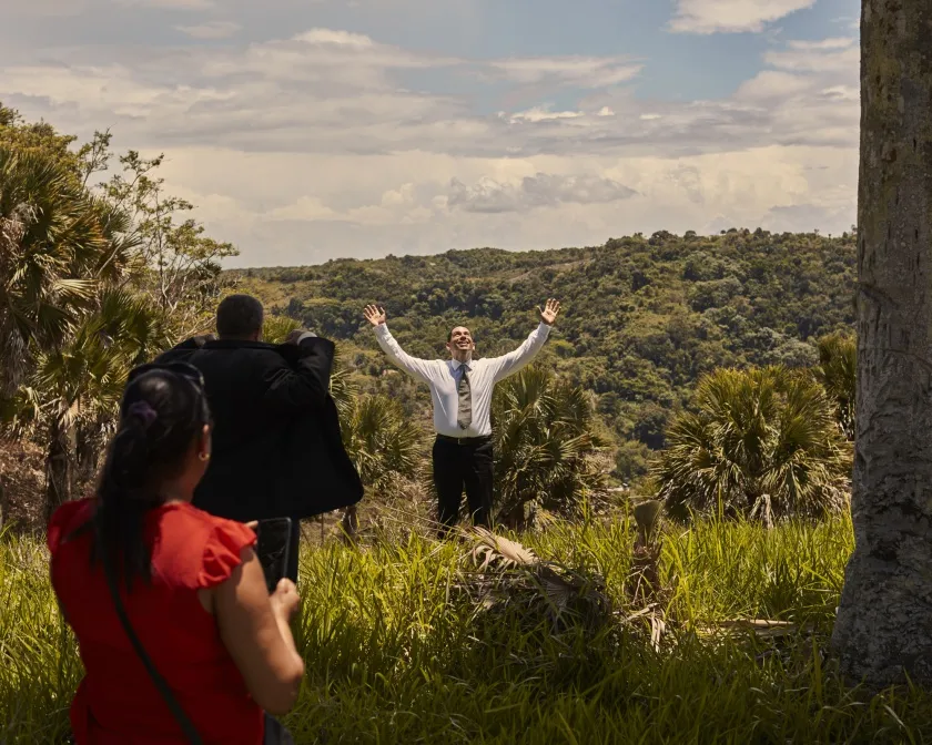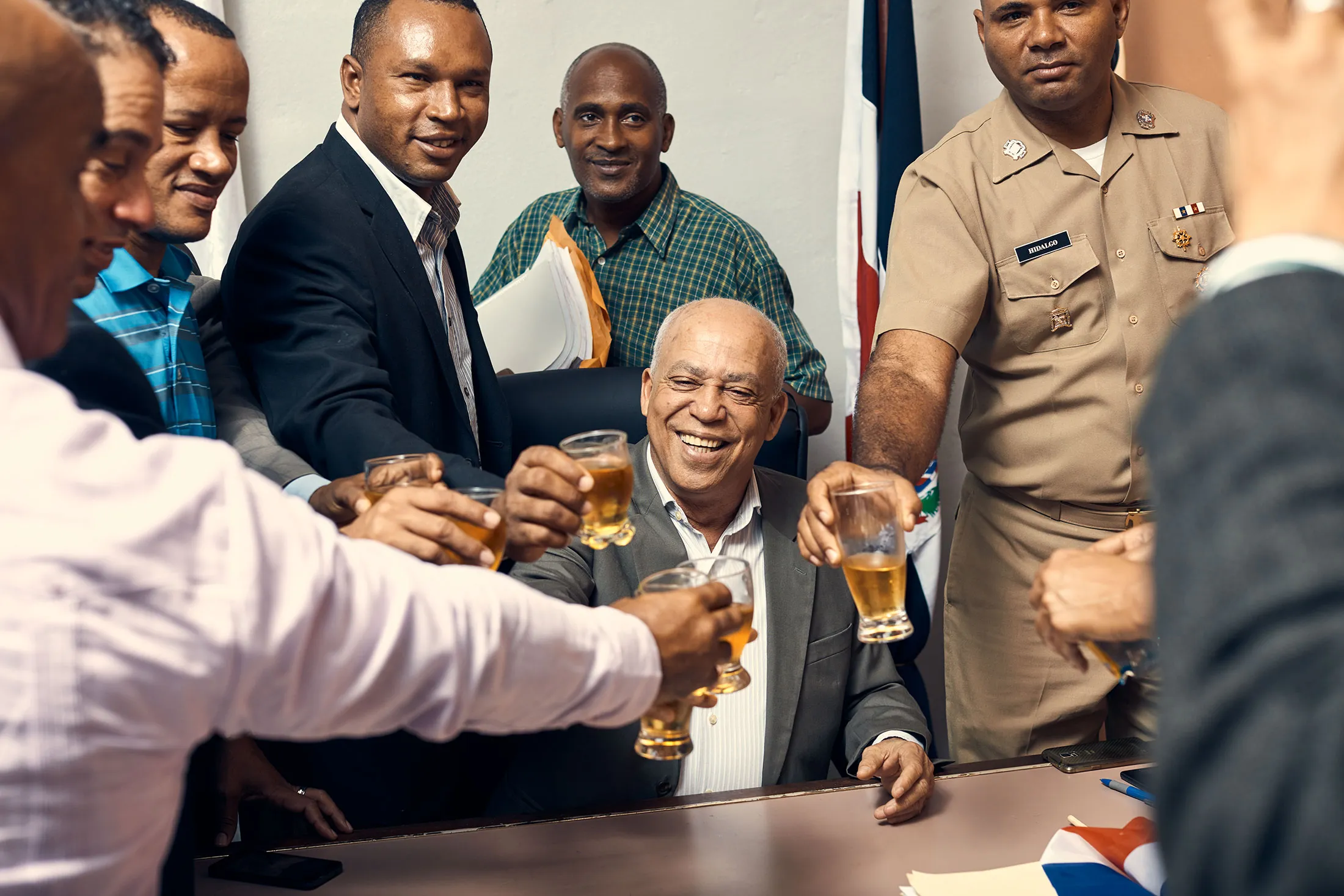 在与一些罗萨里奥家族的继承人举行新闻发布会后的祝酒。摄影:克里斯托弗·格雷戈里人们在波托雷亚尔的办公室里尽情狂欢,赞美上帝;轮流喝着朗姆酒和啤酒。波托雷亚尔喝了一口他用蜂蜜装满的酒瓶里的酒——因为蜂蜜的颜色与哈辛托·德尔·罗萨里奥的黄金相同。当办公室外的人们得知这个消息时,他们也开始庆祝、唱歌,并喝着从天而降的啤酒。几分钟后,波托雷亚尔要求在场的人们安静下来,开始讲话。