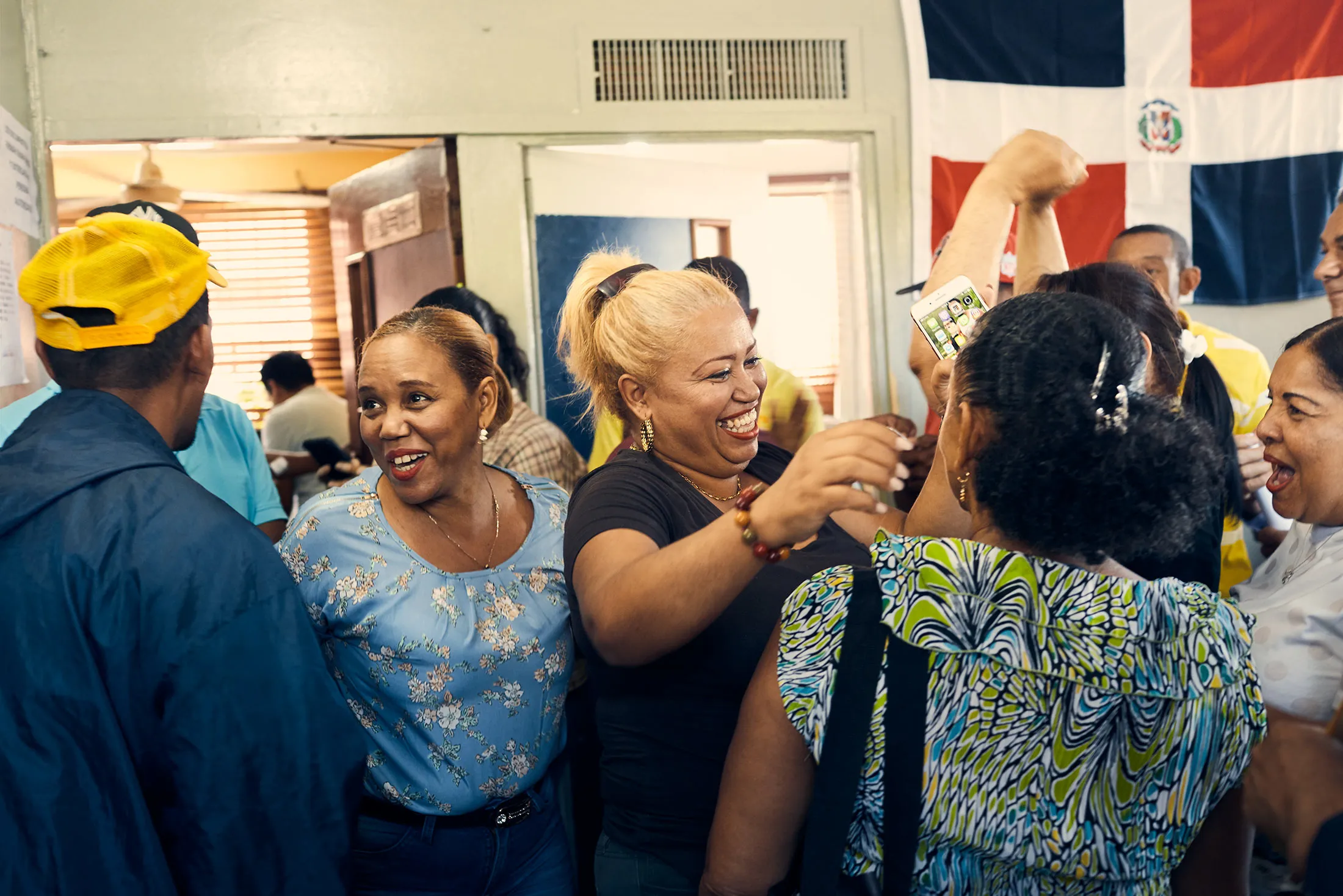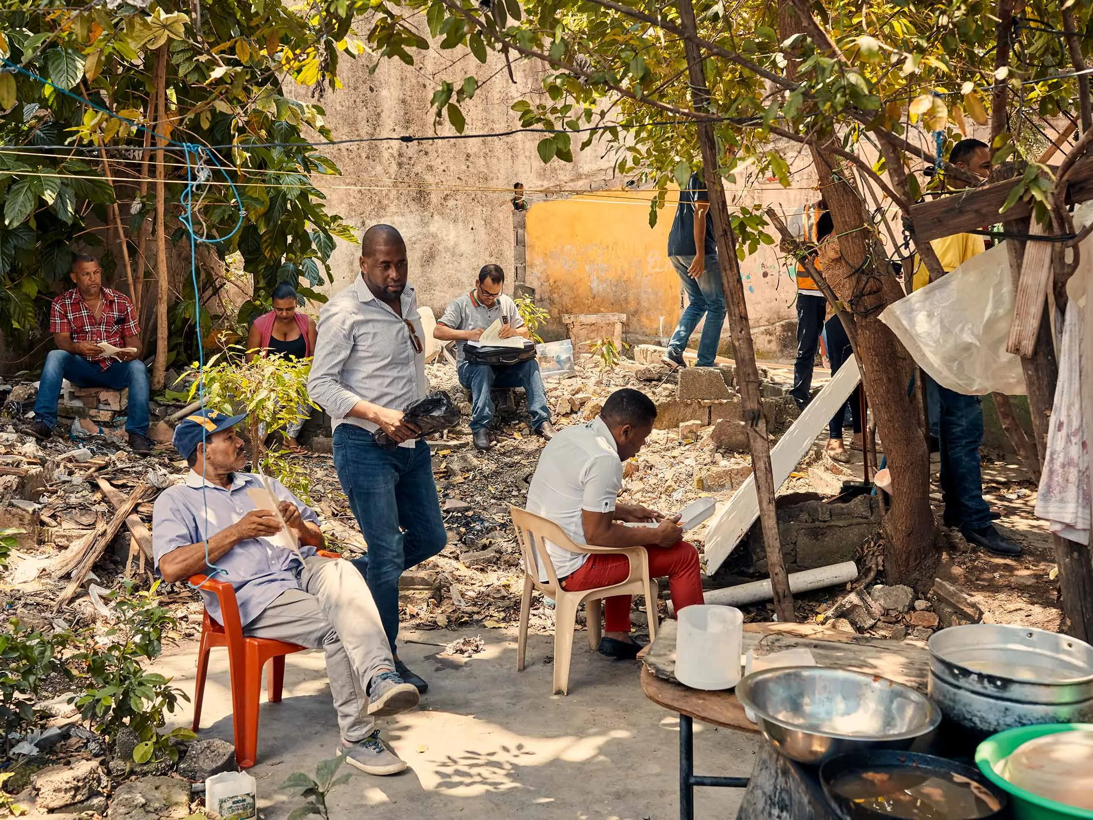 几分钟后,有人指着一条黑色的螺旋楼梯。我上去时看到一个保镖拿着一把半自动步枪,吓了我一跳。他对我微笑并指向一扇门。我经过一个小厨房,几位女士正在做一种叫做桑科乔的多米尼加炖菜,然后进入了一间比建筑其他地方稍微整洁的宽敞办公室。大约20个人坐在椅子和沙发上,所有人都在一位坐在大桌子后面、正在打手机的先生面前等候。他用手指了指一个空椅子。