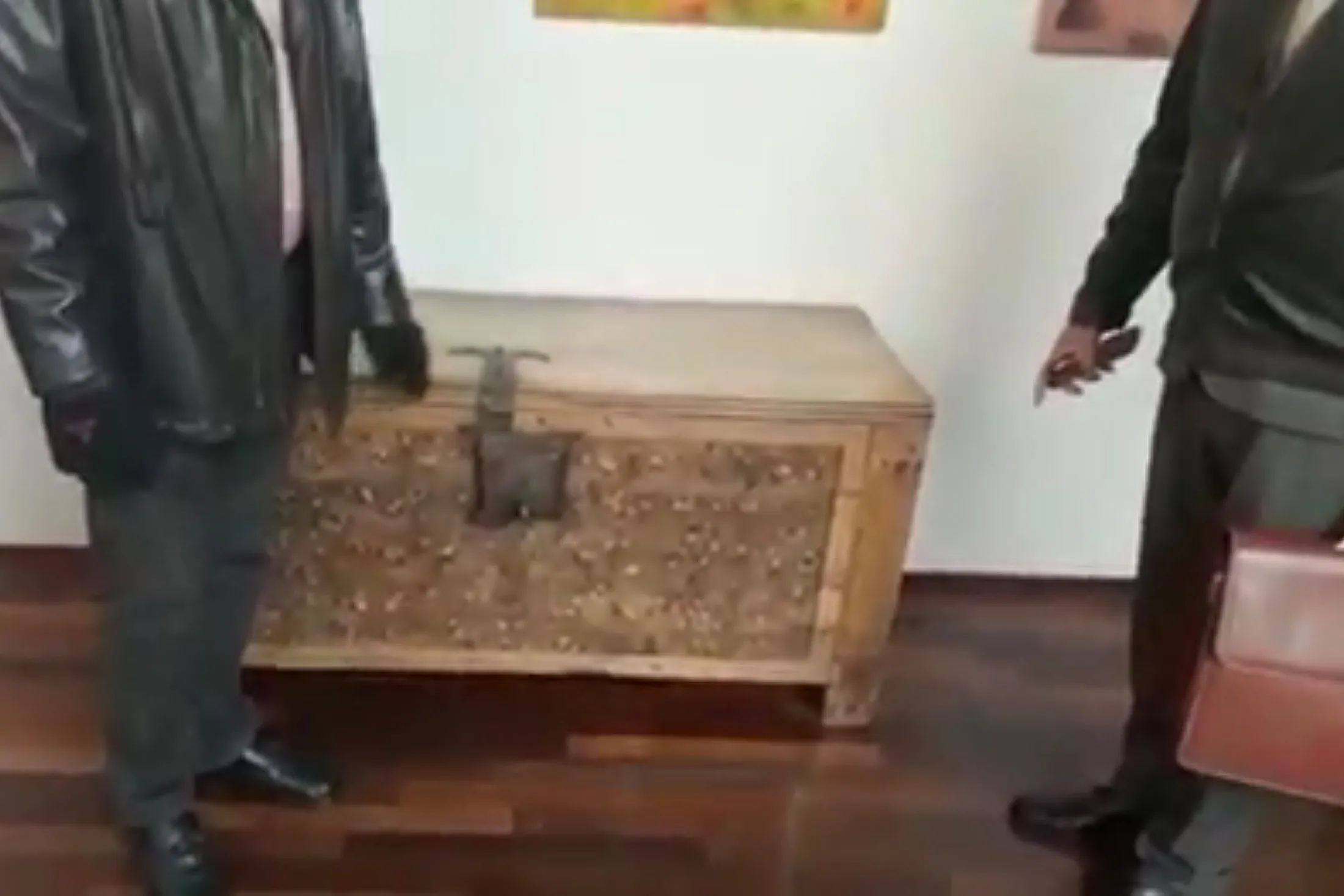 在第三个视频中,我们看到他们将四人带到大厅的一个单独区域。他们走向一个展出的古老行李箱。陪同波托雷亚尔的两位多米尼加人在行李箱的两侧摆姿势。“这个行李箱是雅辛托·罗萨里奥时代的,”波托雷亚尔用西班牙语叙述。