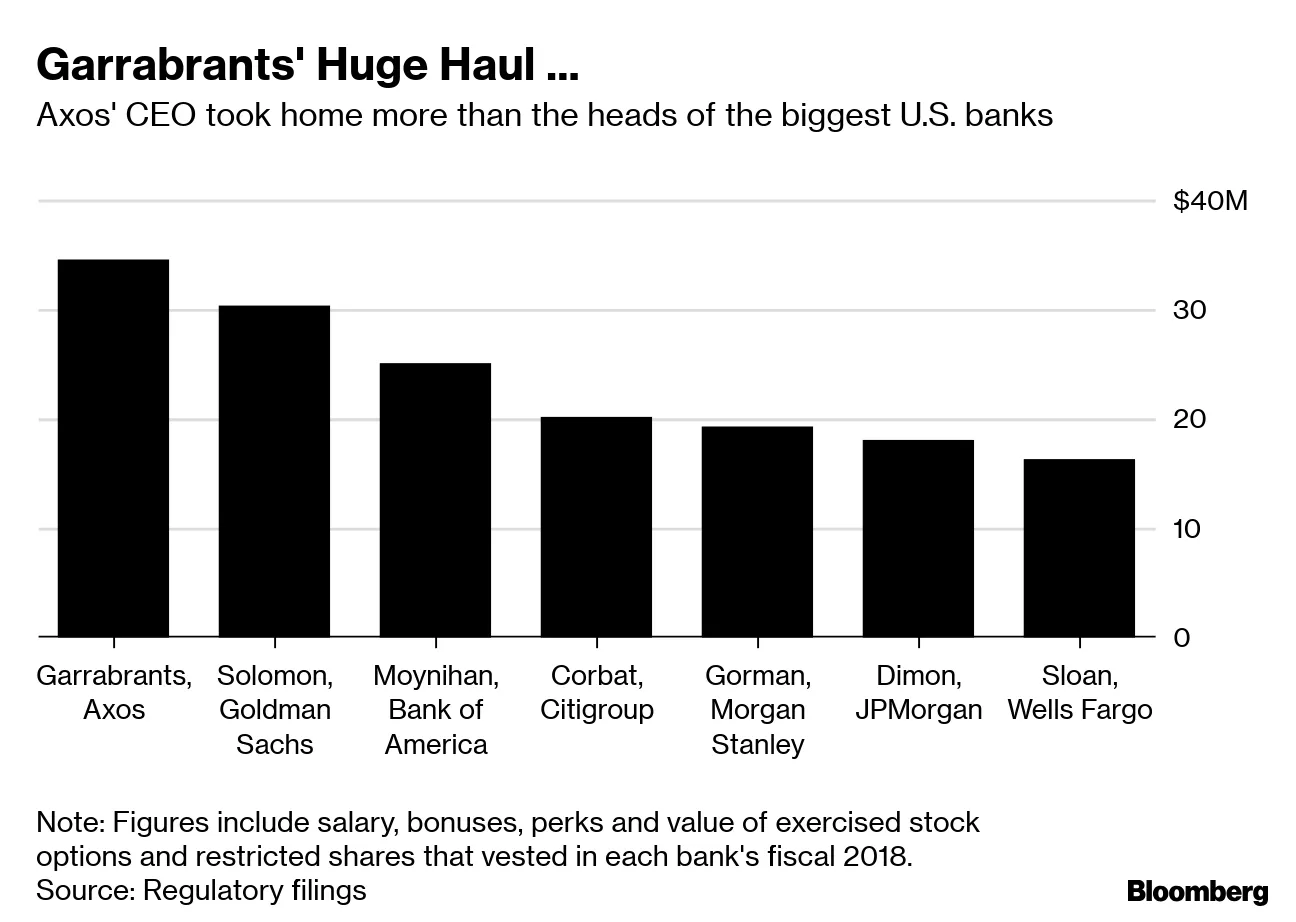 你可能从未听说过在线贷款机构Gregory Garrabrants的运营,然而他去年赚的钱比华尔街最大银行的所有领导人还要多。Axos的首席执行官,这家没有实体分支的互联网泡沫时代初创公司,2018年赚了3450万美元,这得益于将他的薪酬与股价挂钩的协议——这种复杂的薪酬结构在对冲基金中更为常见,结果比预期的要丰厚得多。现在有人在问他是否值得。