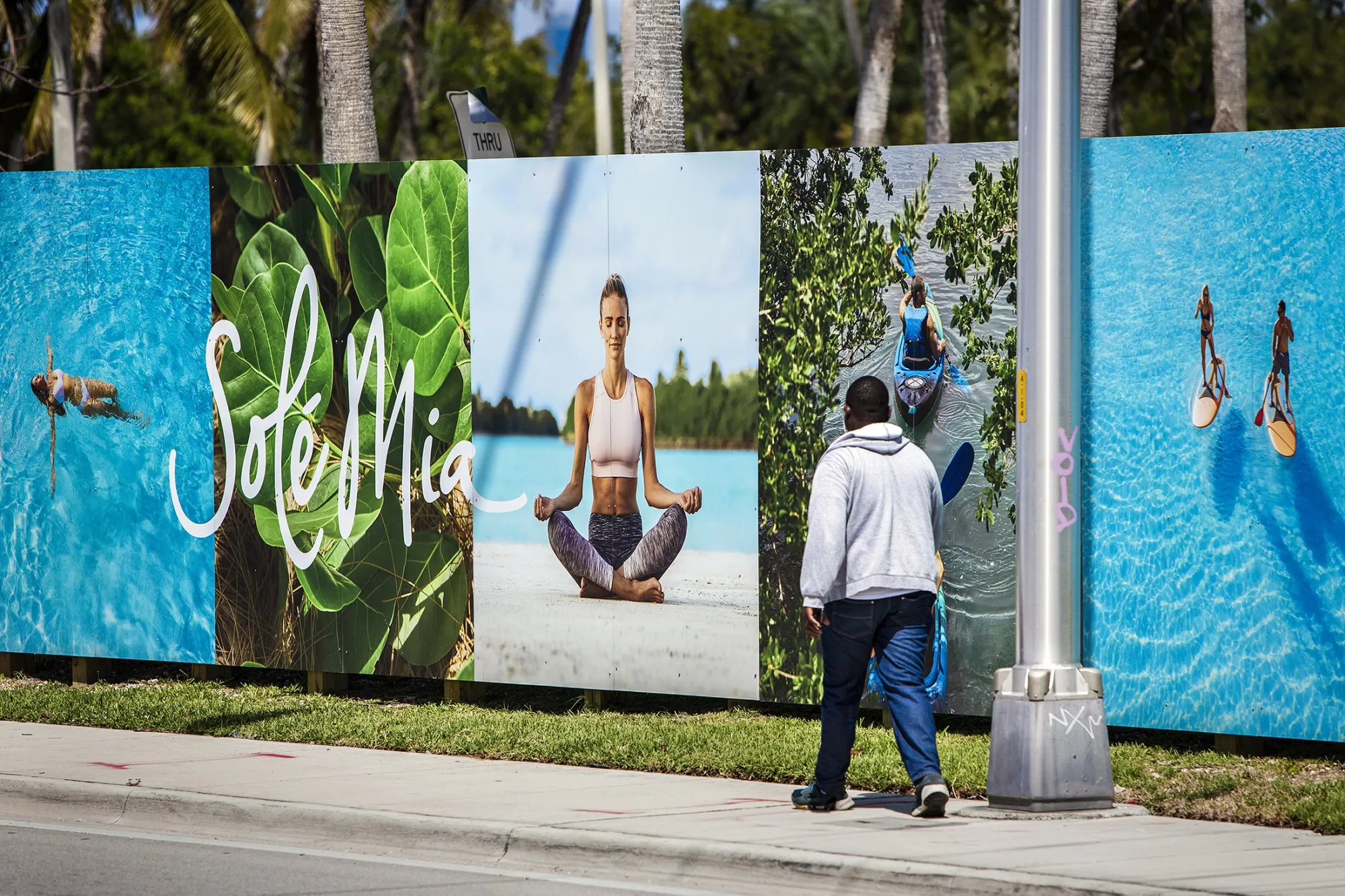 在Solé Mia的施工区域外。摄影师:Scott McIntyre/BloombergSolé Mia周围的广告牌承诺一种富裕的热带生活方式。微笑的家庭在棕榈树下用餐,在白沙滩上打排球,并在清澈的泻湖中划桨。这是一个洁净的愿景,但这个地方却遭遇了无尽的问题。