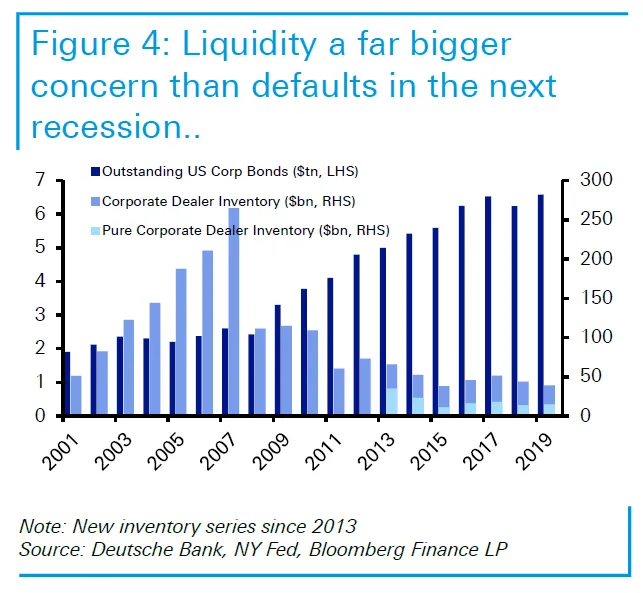 德意志银行的最新违约研究报告,现已进入第15个年头,表明利差不需要像现在这样宽。但它也表明流动性恶化到了这样的程度,以至于市场在违约发生时可能比过去更难应对。以下图表显示了穆迪投资者服务公司对“B”级高收益债券的年违约率,或低于投资级四到六个级别。联邦储备在互联网泡沫破裂后大幅降息后,违约率的下降是显而易见的: