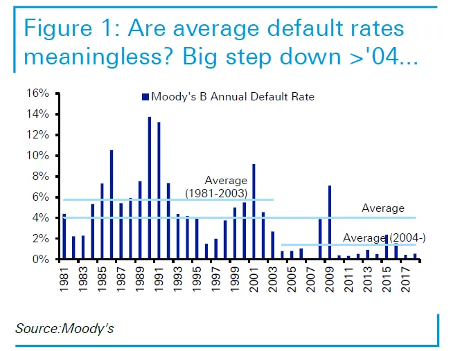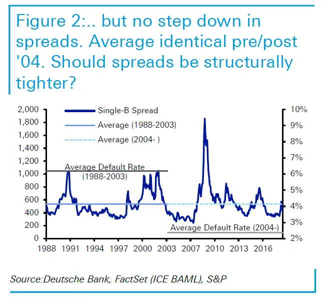 出于某种原因(而这个原因几乎肯定是基础利率的低水平),如今B级信用的违约可能性远低于1980年代和1990年代。对于强劲的BB级信用,情况会更加戏剧化,自危机以来的九年中,有四年没有发生任何违约。然而,市场仍然要求与以往相同的利差来补偿违约风险: