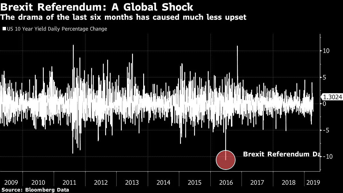 就博彩公司而言,脱欧在今年不会发生的几率很大,但仍然有许多选项。根据货币市场的判断,这并不重要。公投结果导致全球市场出现短暂的痉挛。对安全资产的追逐导致了后危机十年中国债收益率最大的一天跌幅: