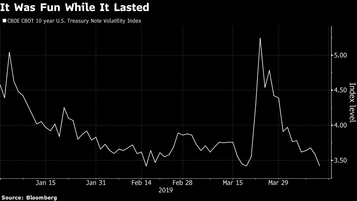 根据三月份会议的会议记录,美联储表示正在应对“重大不确定性”。这使得大多数人认为今年利率应该保持不变,而“几位”官员表示他们对下一步是加息还是降息的看法可能会向任一方向变化。在每次会议的会议记录中,包括经济预测摘要,美联储官员概述了他们对增长、失业和通胀预测的风险平衡,以及这些指标的前景相对于过去二十年是更不确定、较不确定还是同样不确定。官员们表示,三月份这些变量的前景特别模糊的情况总共出现了九次——与十二月的次数相同。因此,如果水晶球更加模糊,那种模糊似乎对美国国内发展没有太大潜在影响。美联储工作人员是你的线索:他们对预测的不确定性水平也被认为“通常与过去20年的平均水平相似”。官员们对失业率的可能演变更有信心,而对通胀的轨迹则不太确定——这似乎表明他们对菲利普斯曲线的信心正在减弱。然而,同一份公报显示,“一些参与者指出,联邦基金利率对劳动力市场紧缩迹象的适当反应可能是温和的,前提是通胀压力的迹象继续有限。”细读其间,这表明即使在没有更高实际通胀的情况下,美国就业和工资的进一步增强也可能足以为再次加息提供理由,尽管不会太多。债券市场似乎更倾向于认为情况并没有那么不确定,至少在长期方面:10年期期货合约的隐含波动率已经崩溃,达到了2019年的最低水平。
