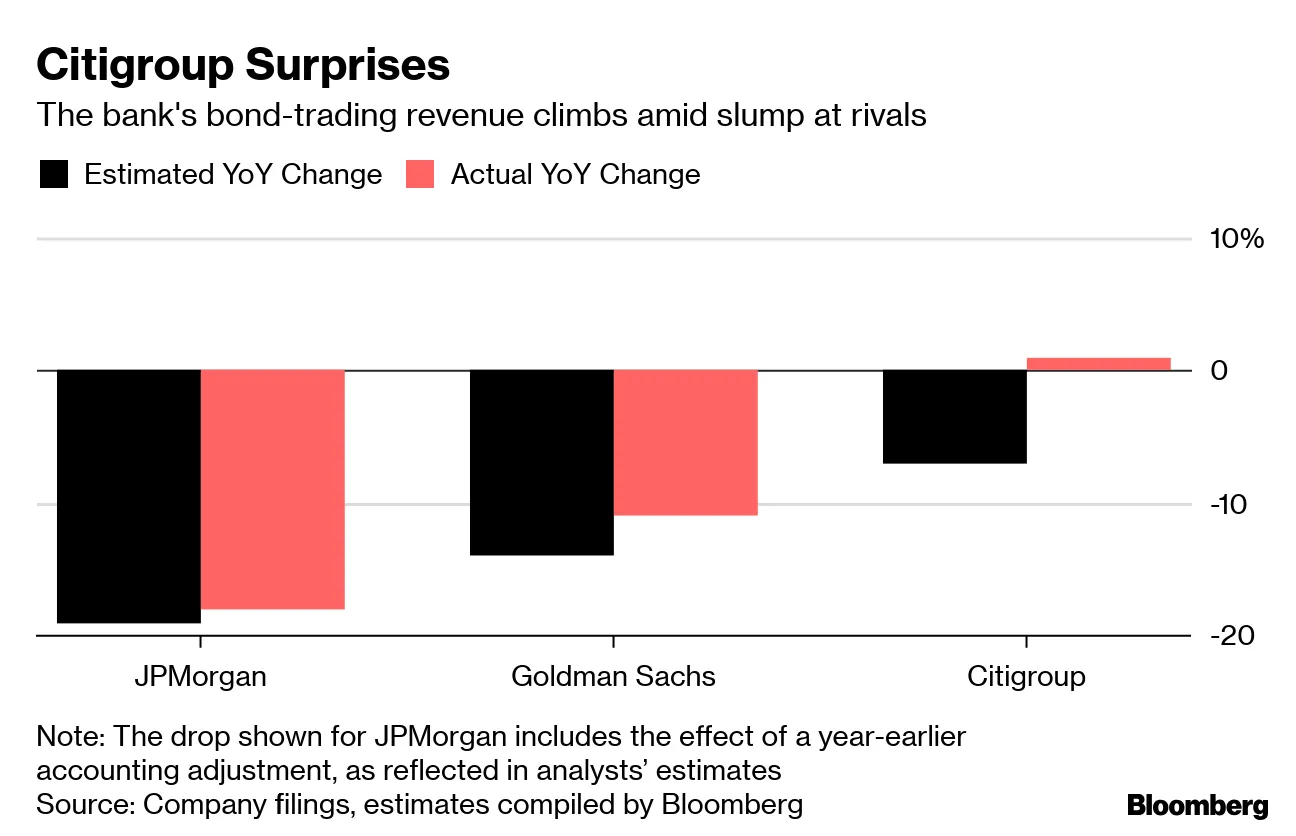 - **在花旗,**固定收益、货币和商品交易员设法将收入提升了1%,与去年相比。但他们在股票方面的同事表现不佳。那里的收入下降了24%,降至8.42亿美元。综合来看,交易下降了5.2%。