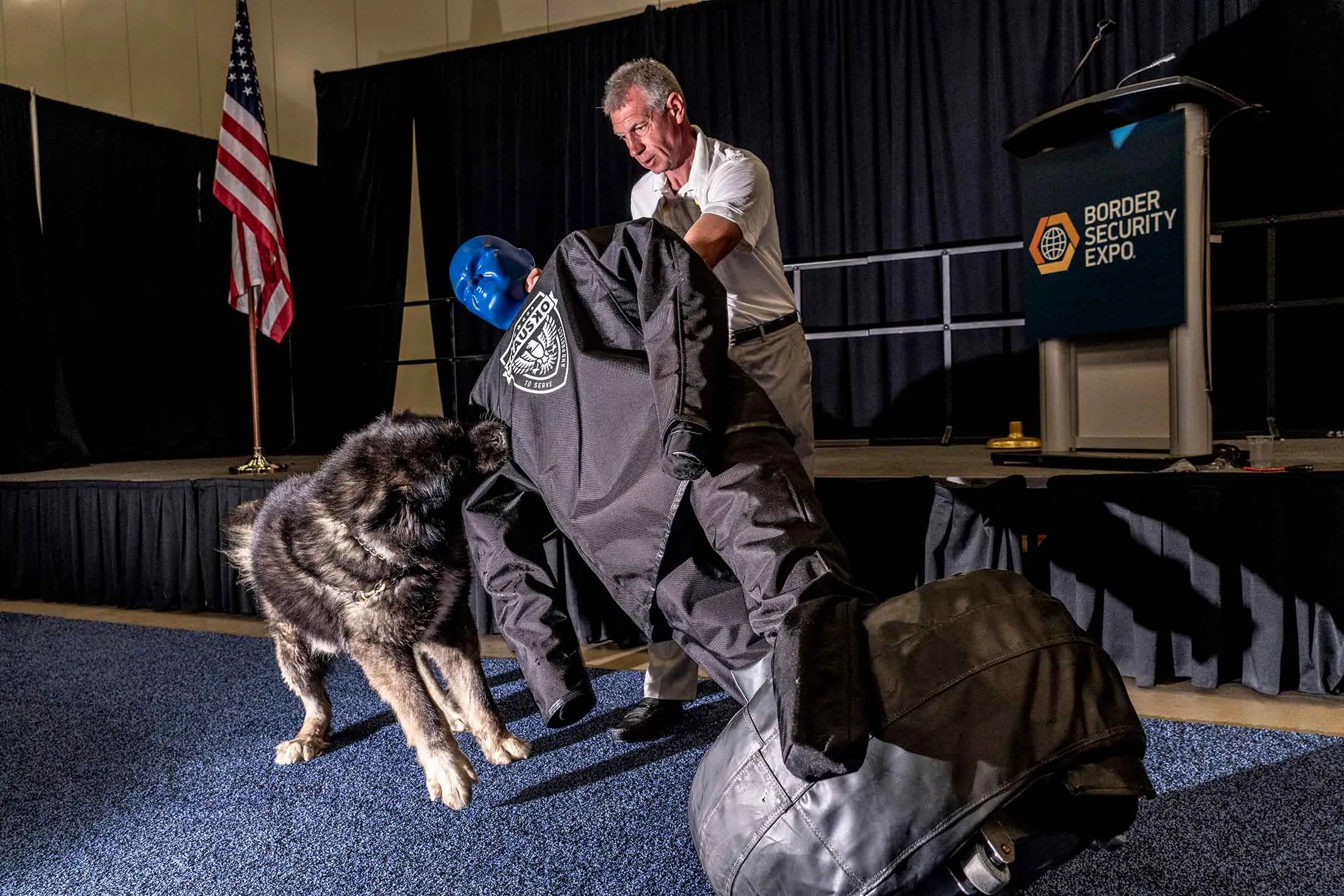 摄影师:马克·彼得森,彭博商业周刊在第十三届年度边境安全博览会于三月底在圣安东尼奥举行期间,美国边境巡逻队的特工们采购监视无人机、无人机禁用频率枪、光纤周界监控系统、安全犬、车辆扫描仪以及其他设备,以阻止毒品和人员非法进入美国。罗纳德·维蒂埃洛,几周后将辞去代理局长职务,成为更广泛的国土安全部清洗的一部分,受到了名人般的待遇。没有人多谈墙的问题。