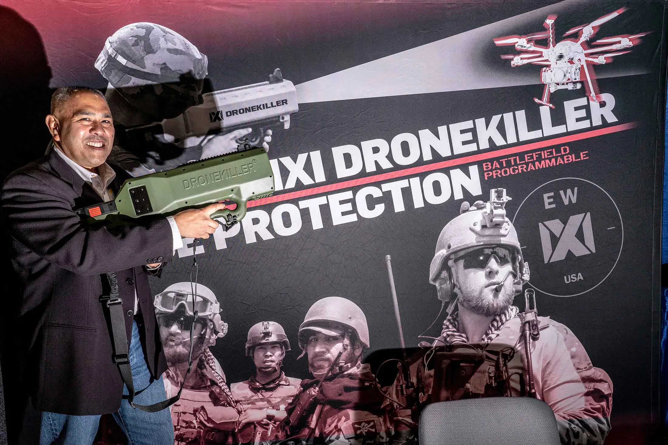 摄影师:Mark Peterson为彭博商业周刊IXI EW的销售和市场总监Andy Morabe手持Dronekiller,该设备产生的无线电信号可以干扰无人机的通信系统。该设备售价32,500美元,仅授权出售给军方和其他美国联邦机构。