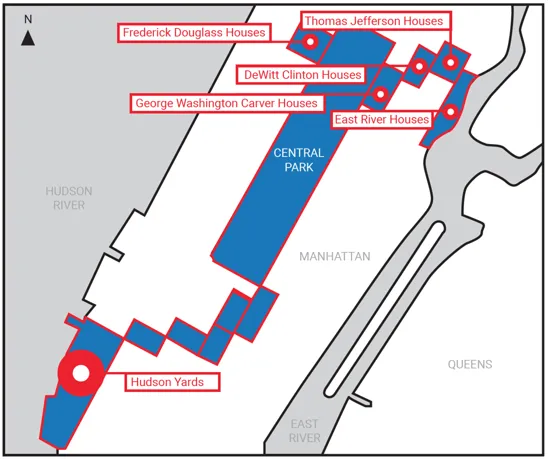这张地图是通过获得的FOIA记录制作的,显示哈德逊园区符合EB-5项目下的困境城市区域资格,即通过将豪华开发与哈莱姆的公共住房项目联系起来。马克·伯恩斯/城市实验室他继续说道: