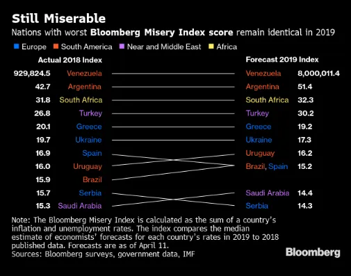 前景黯淡。 今年可能达到惊人的8000000%的通货膨胀使委内瑞拉背负着世界上 最悲惨的经济。泰国 再次 拥有最不悲惨的经济。