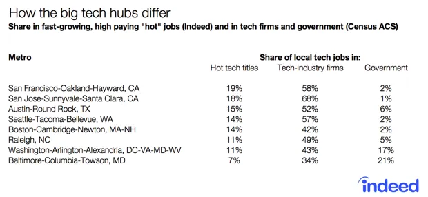 彭博社城市实验室芝加哥以冷静、派对和阳光克服了民主党全国委员会的怀疑者纳粹掩体的绿意改造将丑陋的过去变成城市的眼球吸引者圣保罗的贫民窟如何帮助庇护南美洲最大的城市仅使用公共交通的跨洲竞赛位于硅谷中心的圣荷西拥有最大的高科技职位集中度,2018年几乎占其所有职位发布的四分之一。华盛顿特区的地铁紧随其后,占15%,然后是西雅图、旧金山、巴尔的摩、罗利(在研究三角区)、奥斯丁和波士顿。