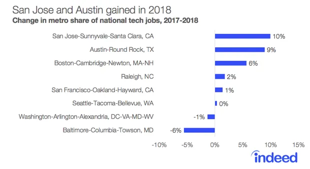 新的研究由招聘网站Indeed.com的首席经济学家杰德·科尔科进行,发现美国的既有科技中心继续主导高科技就业。他的研究基于2018年来自Indeed.com的职位发布数据,考察了全国51个最大城市(人口超过一百万)的科技职位,以及2015年至2017年的普查就业数据。