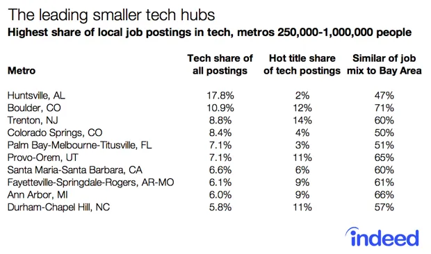 那么“其他地区的崛起”呢?科尔科发现,实际上,较小的科技中心正在主导城市之外成长,以利用更低的生活成本、不同的人才库和地理多样性。