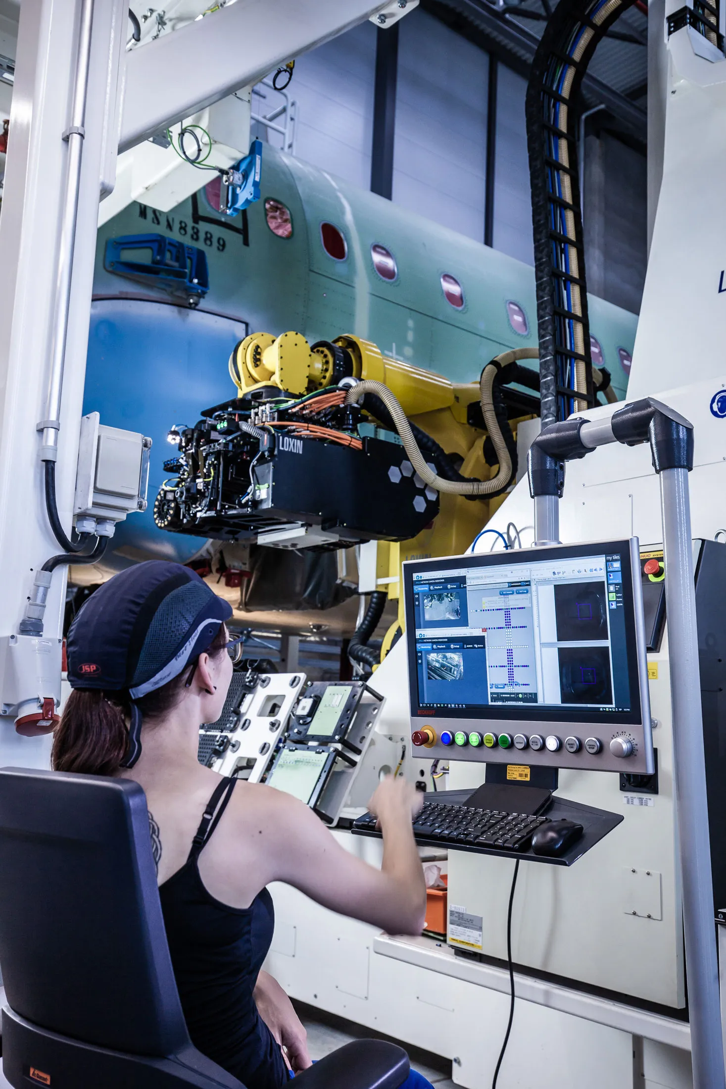 为新生产线确定空间是简单的部分:一个巨大的机库,工人在这里安装庞大的A380的内部,由于对双层飞机的需求低,几乎闲置。空客从它所称的“干净地面概念”开始,空间内只有少数固定设施,比如在门口的黄色起重机,用于将大型结构部件吊入建筑物内。飞机不是沿着生产线移动,而是在移动平台上像16吨的芭蕾舞者一样旋转,这些巨型结构可以由一个人通过遥控操控。前起落架由一个庞大的机器人手臂安装,该手臂折叠在飞机下方,并通过计算机控制台进行控制。两个机翼的对齐是同时进行的,从而节省时间。A320的前后部分通过激光引导在一起,这一过程将组装时间缩短到半小时。然后,两个部分由一对巨大的机器人连接,分别被称为Luise和Renate,以区分左右。这对双胞胎姐妹每个重22吨,它们的多方向手臂可以伸展超过20英尺,在每架飞机上钻出2400个孔并用铆钉填充,所有这一切的精度超过了其他生产线上的人类。