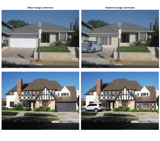 各种大小的住宅车库都非常适合改建为住房单元,正如这些效果图所示。舒普/布朗/穆基哈许多城市拥有一个巨大的、未开发的可负担住房来源:车库。根据我们的估计,洛杉矶大约有 400,000 套独栋住宅拥有可以改建为公寓的双车库。直到最近,洛杉矶禁止大多数此类改建,但在 2017 年, 加利福尼亚州颁布了一项法律,该法律覆盖地方禁令,允许几乎所有房主将他们的车库改建为附属住宅单元(ADU)。在新州法律生效之前的 2016 年,洛杉矶仅发放了 117 个第二单元的许可证。到 2018 年,它发放了 4,171 个许可证,或每发放一个 2016 年的许可证就发放 36 个。