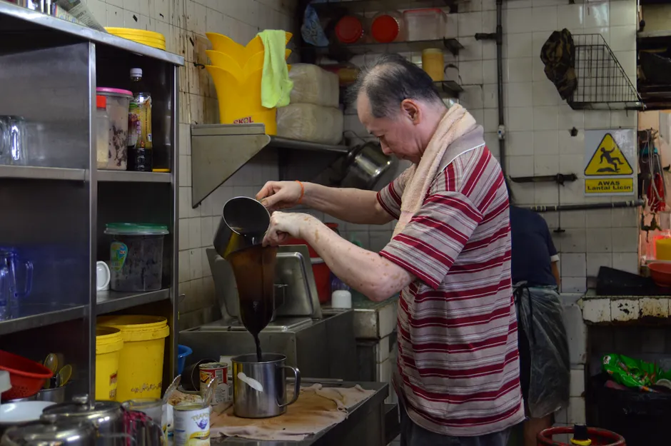 丁在咖啡店的后厨用筛子过滤咖啡。他已经制作传统咖啡超过二十年,之前是向他的父亲学习这项技能。汉娜·贾姆布纳坦,2019咖啡店(这个词在华人福建方言中翻译为“咖啡馆”)是马来西亚最古老的存活咖啡馆。许多咖啡馆自殖民时代以来就存在;在19世纪末,咖啡曾短暂成为英国的经济作物。这些露天咖啡馆形成了历史悠久的社区聚集空间,随着时间的推移,逐渐被视为珍贵的堡垒,在多元文化的马来西亚中促进多样性和公民对话。