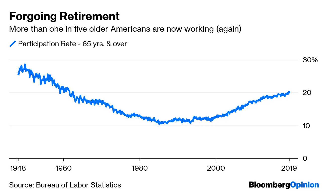 在57年来的第一次, 超过20% 的65岁及以上的美国人正在工作或希望工作,这一比例是1985年10%的低点的两倍。更多的人即将加入: 美国劳工统计局 预计,老龄化的婴儿潮一代将在未来至少八年内代表劳动参与率的最强增长。