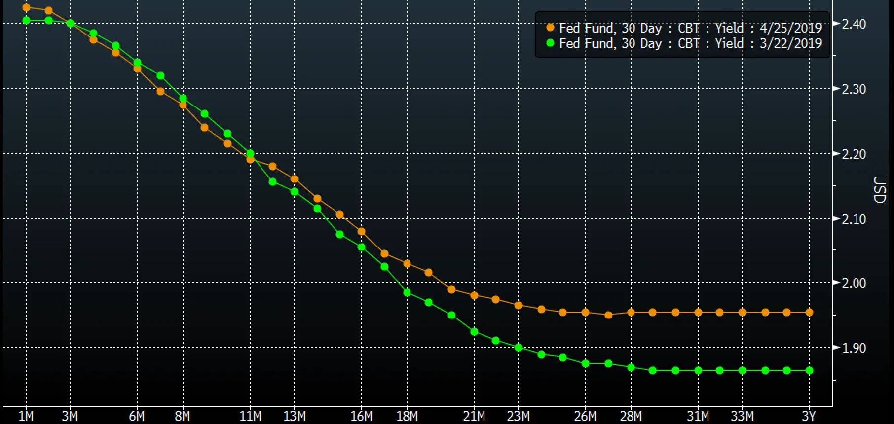 关于 1998年类型的美国降息出现了一些讨论。 但正是金融市场的疲软助长了那次降息,而债券交易员Ed Bradford建议1995年的经历 – 在债券市场的情绪波动后降息,给美联储留下了过度收紧的印象,因为通胀保持低迷 – 可能是更好的类比。美联储似乎愿意给通胀留出一些空间,这意味着对久期的最大威胁 – 更高的通胀迅速通过加息来消除 – 可以说不再那么令人担忧。复杂化局势的是美联储与金融市场之间的关系可能发生了变化,因为私人预测者的准确性与货币政策制定者大致相当,根据高盛集团最近的一份报告。 虽然这种动态可能越来越突出,但似乎与最近发生的事情有些不协调:美联储的鸽派转变似乎并没有显著增强对价格压力或活动增加的预期。或者也许情况更为微妙:预测者现在可能对美国扩张结束的担忧减少(这将可能引发一系列降息),但仍然相信美联储可能会采取更温和的主动措施,以增强通胀预期。为此,比较一下当前12月联邦基金期货的水平与该合约上次交易在此水平时的情况。与3月底相比,交易者现在在边际上更早地定价更多的宽松,但在接下来的三年中明显减少。