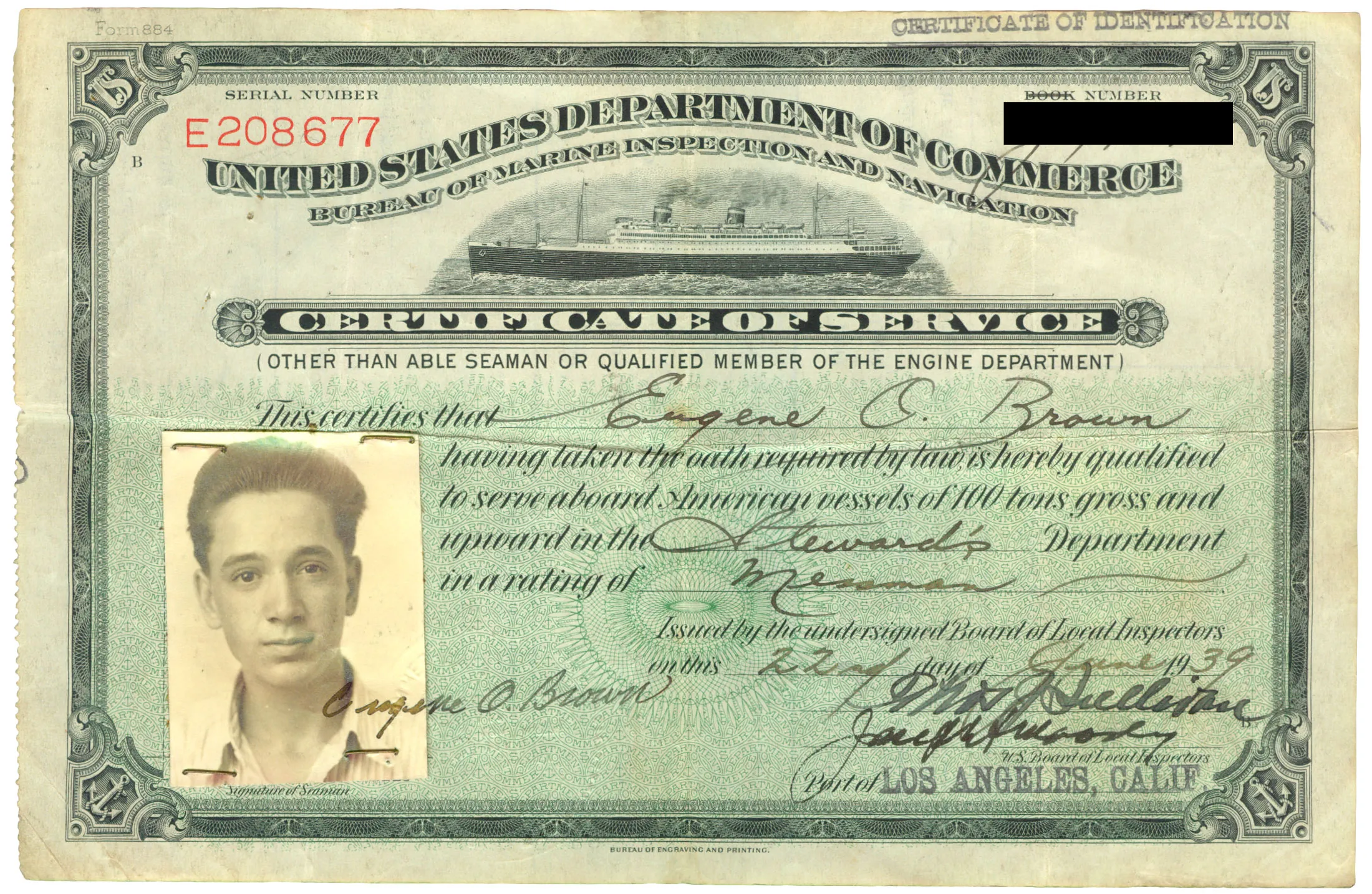在布朗的案例中,他们发现了以下内容:他于1922年出生在圣荷西,父母是从俄克拉荷马州迁来寻找工作的。他有一个兄弟和一个姐妹,二人都在几十年前去世。1939年夏天,布朗被现已解散的海洋检查和导航局认证为小屋服务员,该局执行有关商船的法律。他的照片身份证显示他是一个面容稚嫩的16岁少年,棕色眼睛和凹陷的脸颊。1941年,布朗被一家挪威航运公司聘为所谓的伙食员或餐饮服务员,月薪为79克朗(当时约18美元)。罗德里格和提瑟兰知道这一点,因为他在一本会计书中详细记录了他的薪水和开支。1942年1月,在第二次世界大战中期,他离开了那份工作,转而在美国商船队担任类似的工作。
