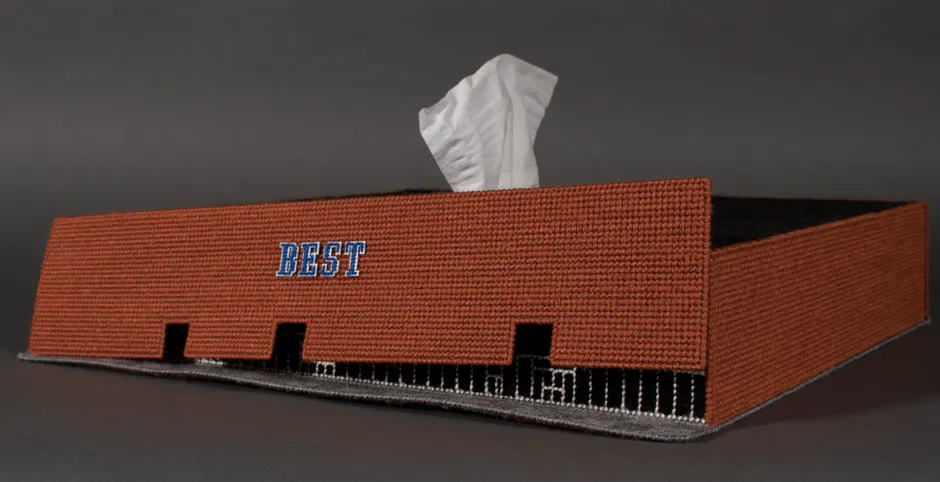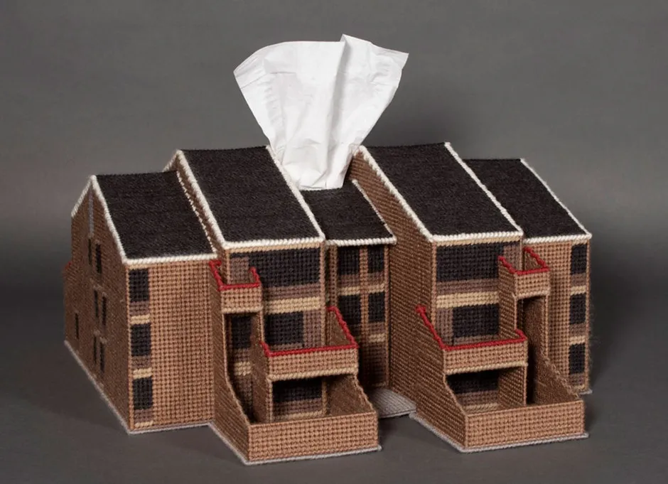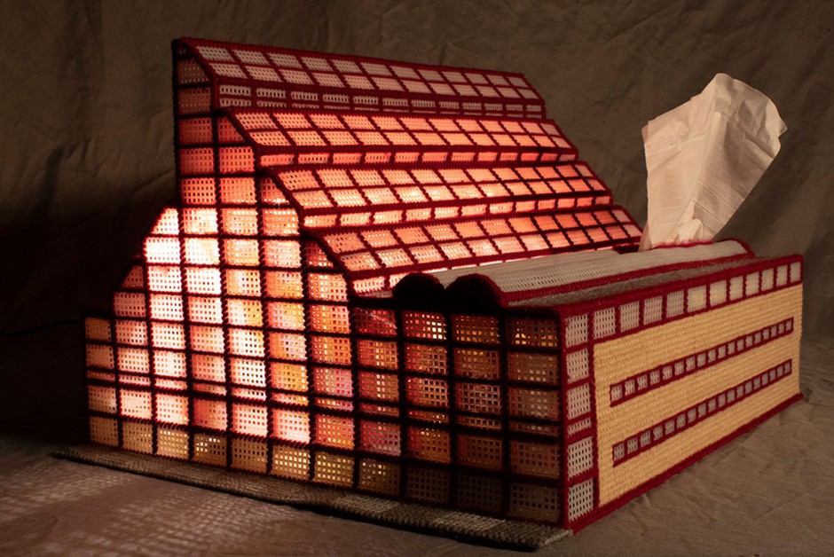 一座被拆除的塞萨尔·佩利建筑在“可丢弃:尼亚加拉大瀑布冬季花园”中重新构想。塑料画布,丙烯纱线,LED照明,纸巾盒,11 x 15 x 22.5英寸,2016年。库尔特·特里比作为一名受过训练的画家,位于布法罗的艺术家 库尔特·特里比 随后将他对纤维艺术和建筑的兴趣转化为反思建筑环境中失落的机会,通过塑料画布和纱线重建建筑——通常作为纸巾盒。在制作这些迷你复制品时,特里比旨在使用那些已被改变或拆除的可识别建筑,通过纸巾的关联为哀悼增添额外的意义。