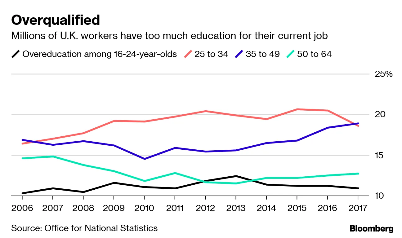 数百万英国工人对他们的工作过于资格。国家统计局表示,2017年,16至64岁就业人员中有16%的人受教育程度超过了他们职位的要求。它估计毕业生的过度教育比例为31%。伦敦的过度教育工人比例最高,约为25%。过度教育对纳税人和个人造成了成本,并被认为是英国生产率表现不佳的原因之一。