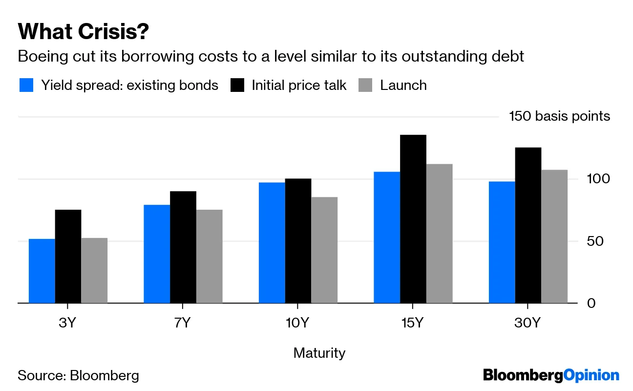 尽管面临困境,波音公司今天在债券市场却 一片晴朗,写道 布赖恩·查帕塔。