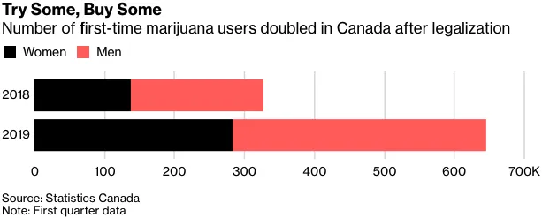 **首次吸食者。**一些646,000名加拿大人表示他们在1月至3月期间尝试过大麻,几乎是去年同期327,000名首次吸食者的两倍。新用户中有一半年龄在45岁以上。