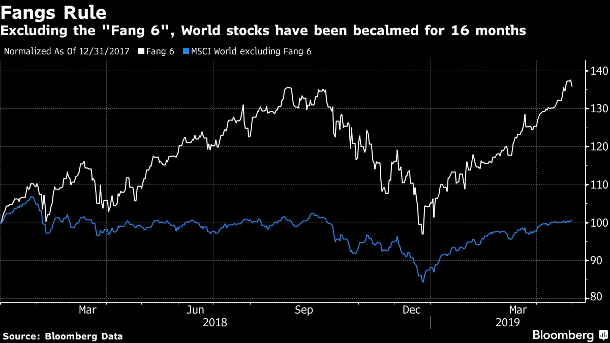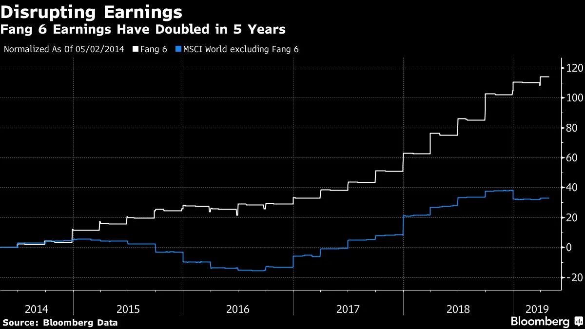 不包括Fang 6,自去年初以来,全球股票几乎没有任何表现。这至少部分是因为Fang 6以外公司的收益表现相当不佳——而这六家公司在五年内每股收益翻了一番以上: