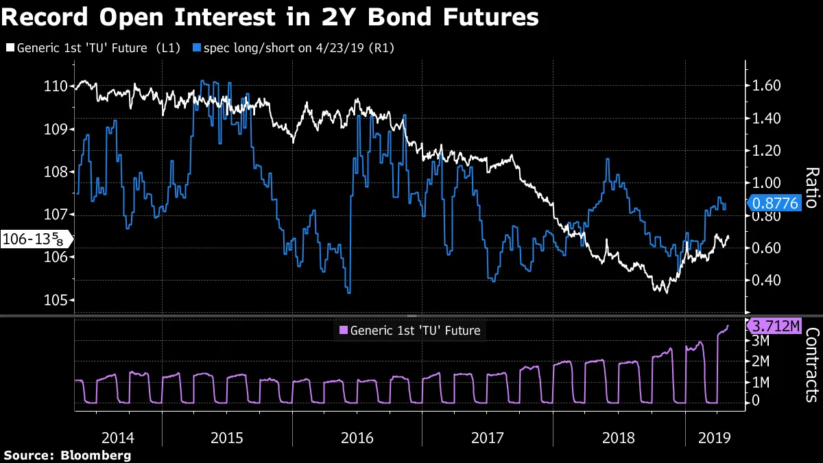 这次情况不同。要理解这一点,必须知道本周会议前的预期是什么。尽管第一季度GDP数据强于预期,但欧元美元期货的主流趋势是,预计到9月美联储将降息的合约的未平仓合约数量激增。两年期国债期货的未平仓合约数量也创下纪录,持仓越来越偏向多头。