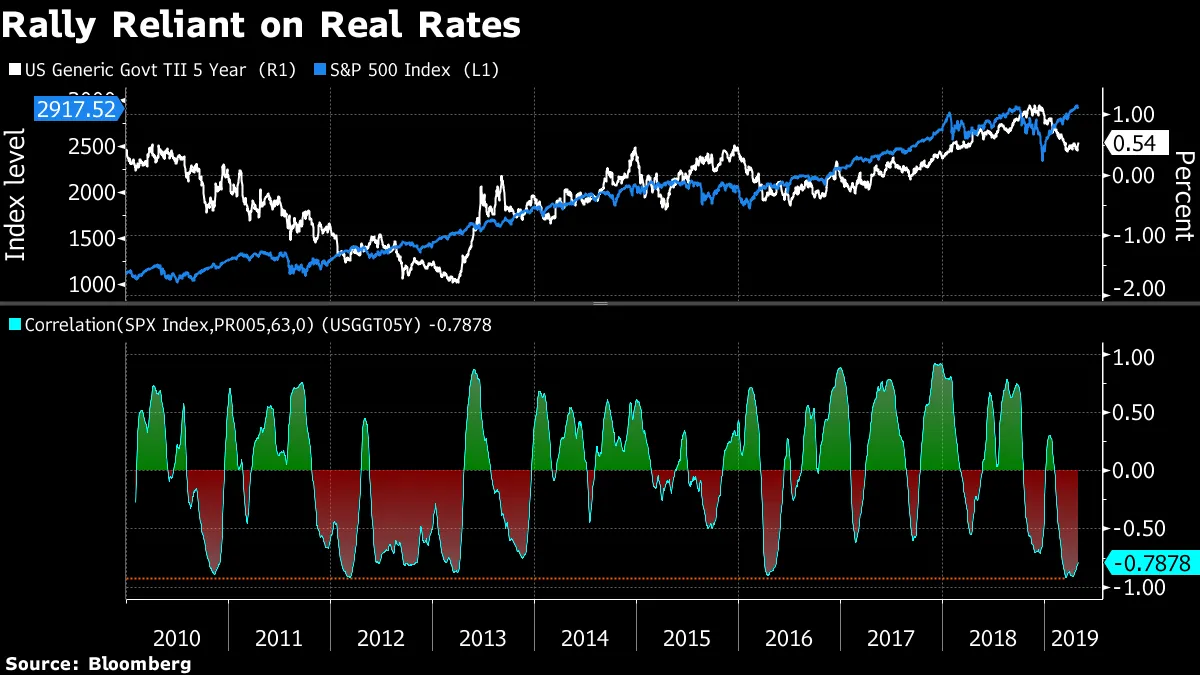 五年期国债通胀保护证券(TIPS)收益率与标准普尔500指数之间的负相关关系在今年非常强劲,突显了美联储的鸽派转变在多头市场中复兴的程度。