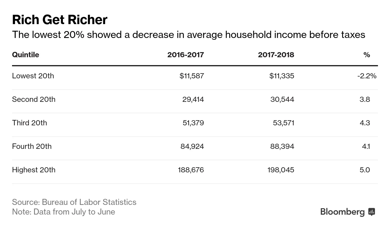 大多数美国人去年看到薪水增加和支出增加,但最贫困的人却没有。在截至2018年6月的一年中,底层20%的家庭平均收入下降了2.2%,降至11,335美元。尽管他们的支出比前一年少了0.5%,但他们的支出仍然超过了收入,与富裕的美国人相比,他们在食品和住房上的支出占收入的比例更高。对于一些贫困家庭来说,特朗普政府重新定义贫困的举动可能会使他们获得援助的机会面临风险。