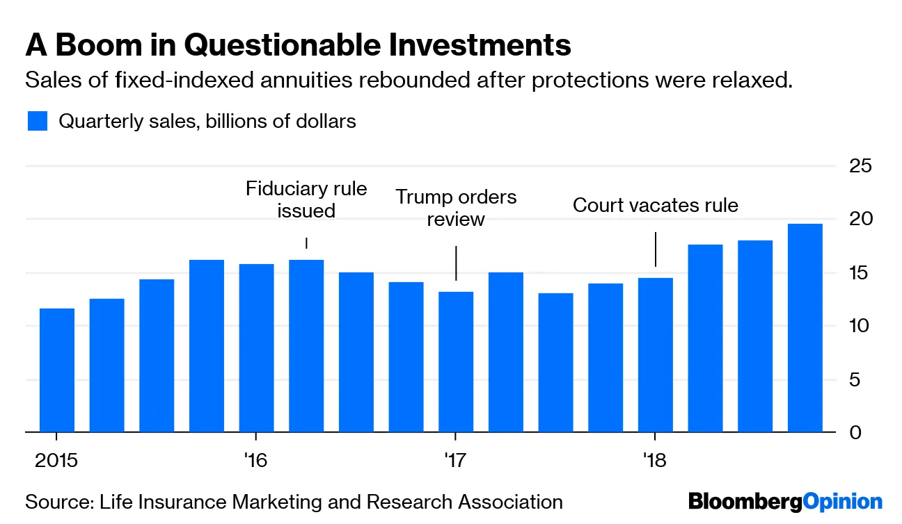 特朗普政府放弃 受托责任规则 可能会让未来的退休人员损失数十亿,前财政部官员伊桑·施瓦茨为彭博社观点撰文。该规则要求经纪人在获得佣金引导人们投资特定产品时进行披露,并禁止销售潜在有问题的投资产品。现在,销售正在蓬勃发展,而没有新的努力能够接近该规则的标准。应该恢复并适用于所有投资账户。