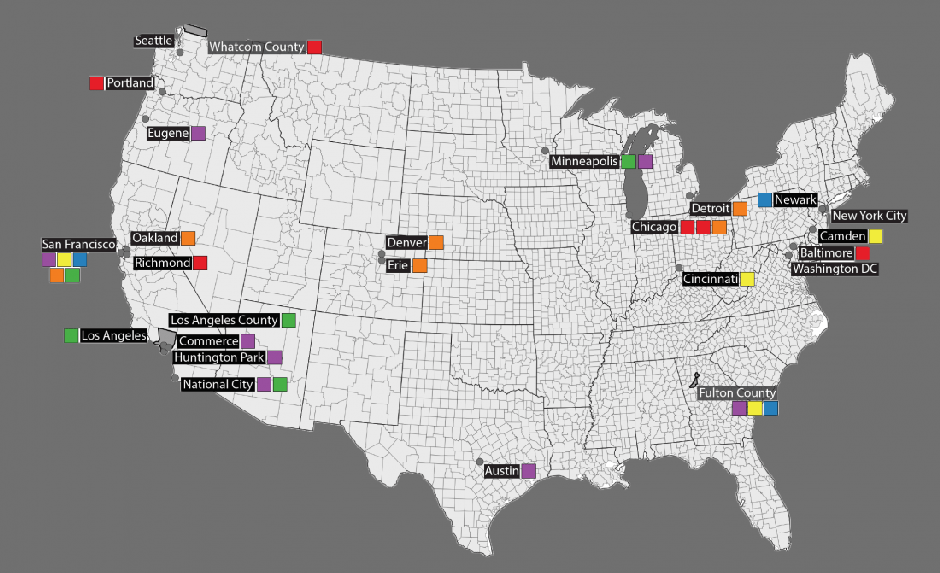 西雅图公共事业局在历史上负担过重的社区拥有重要的土地资产,努力进行有针对性的投资,以减少这些地区的污染。而加利福尼亚州洛杉矶在2016年的一项名为“清理绿色法令”的政策中使用了“绿色区域”的概念,在博伊尔高地、帕科伊马/阳谷和威尔明顿建立了清理绿色区域,在这些地区,城市对新建筑施加更严格的开发标准,并努力减少负面健康影响。2017年,明尼阿波利斯,明尼苏达州,提出了一项旨在绿色区域的市议会决议,以改善健康并促进可持续经济发展。