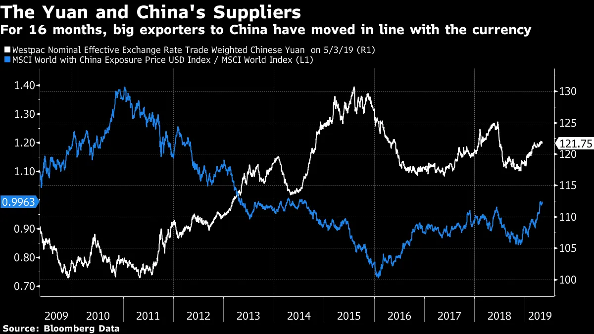 我有点怀疑特朗普是否在玩这样的战略棋局,但这与事件是一致的。与此同时,他确实必须应对另一个问题,那就是外汇市场。下面的蓝线是自2009年以来MSCI中国曝光指数的相对表现。白线是西太平洋银行对人民币的贸易加权指数。当它上升时,中国的竞争力下降,反之亦然。看起来这两条线之间的关系已经逆转:
