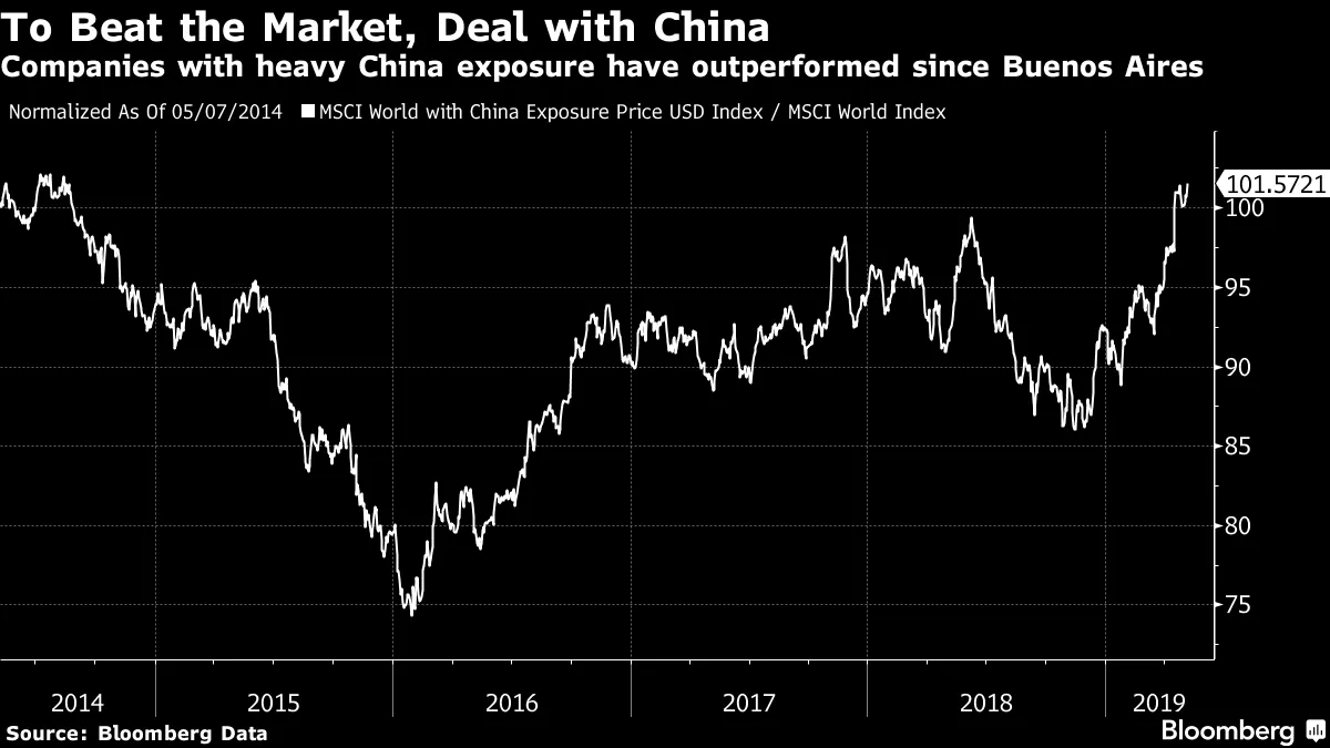 这种逻辑对我来说是合理的,对其他大多数人也是如此。但看起来今年的股票价格似乎是将这样的协议视为百分之百的确定性。为了说明这一点,看看MSCI全球中国暴露指数(该指数包括在MSCI全球指数中对中国暴露最大的100只大盘股)与MSCI全球指数的表现: