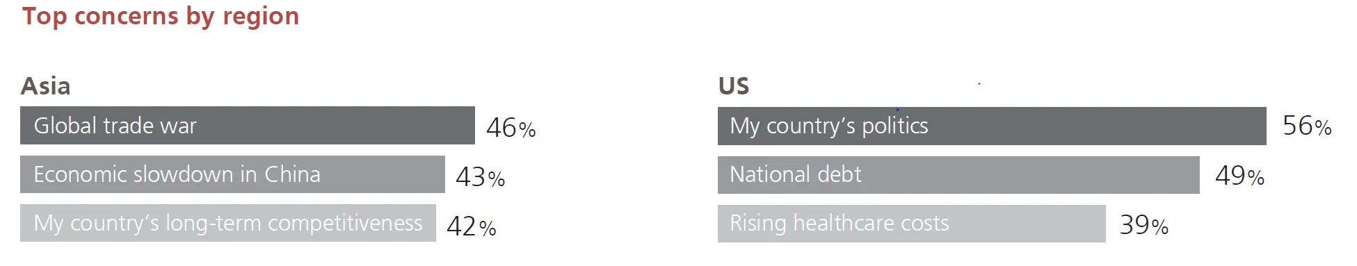 根据瑞银的调查,亚洲投资者也最害怕全球贸易战和中国经济放缓。但美国投资者将“我国家的政治”列为他们关注的首位。他们还担心国家债务和不断上升的医疗成本(这一清单表明,他们对目前的总统任期并不太满意)。