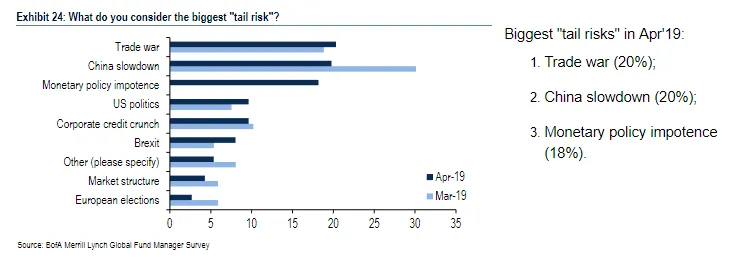 基金经理和富人有类似的担忧,这可能阻止他们投入更多资本。但有趣的是,地区间存在差异。根据美国银行的调查,贸易战紧张局势、中国经济放缓和货币政策无能是全球基金经理最大的三大担忧。