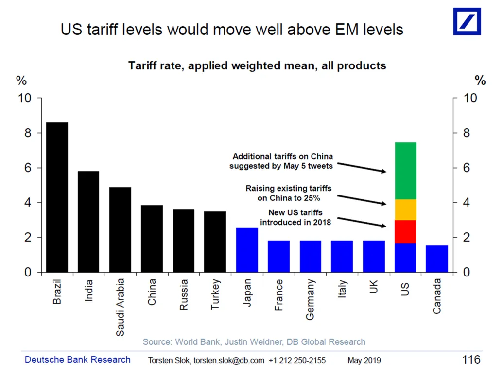 这样想是有理由的。特朗普让人感到恐惧,这也是他的一个重要优势。但很容易争辩说他的威胁并不可信。如果美国对他在推特上概述的关税进行征收,最终将面临比许多新兴市场更高的关税壁垒。正如德意志银行策略师托尔斯滕·斯洛克的这张图表所示,特朗普的威胁似乎几乎不可信: