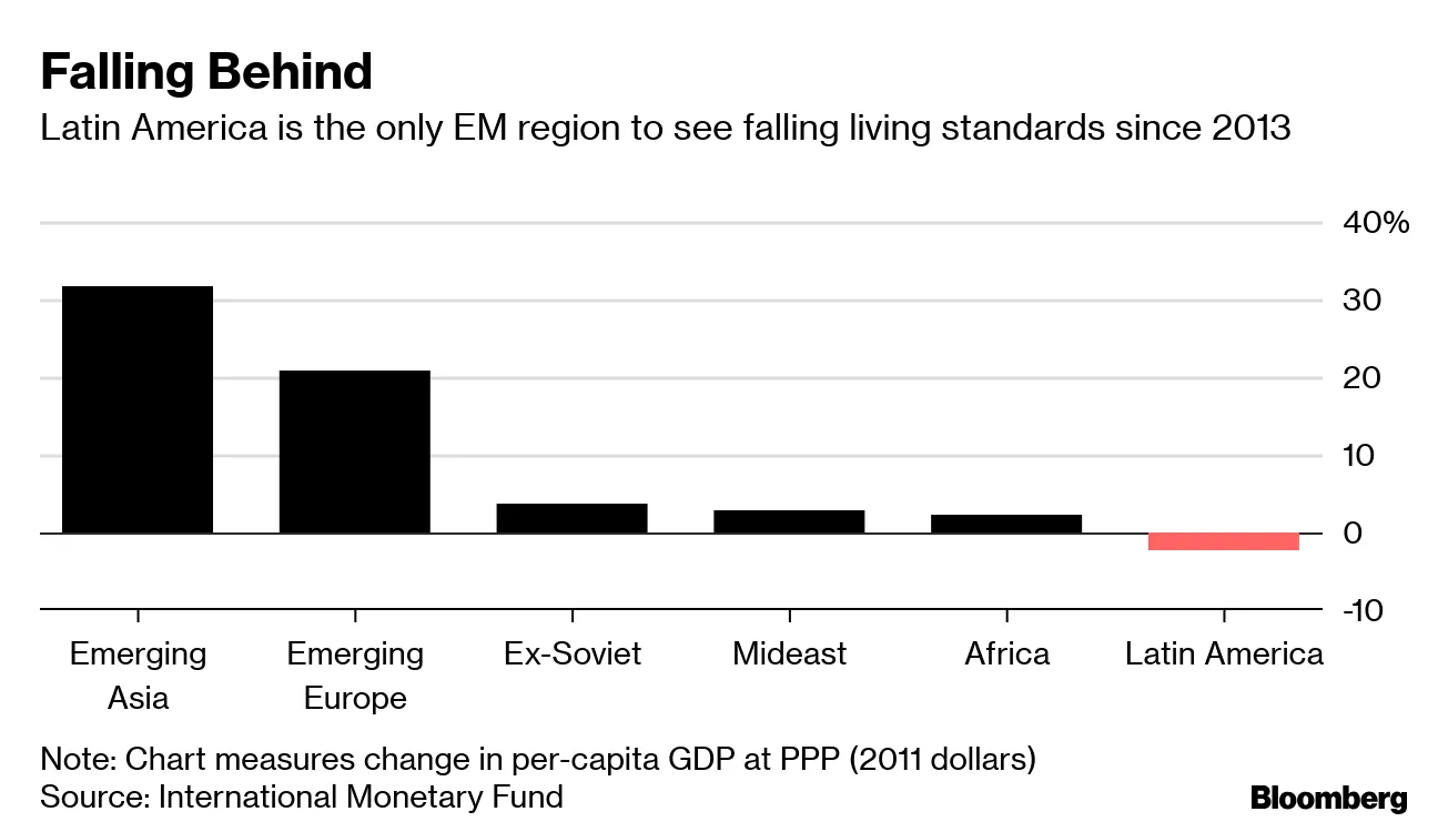 拉丁美洲 两个最大国家的经济停滞帮助了民粹主义者上台,但这并没有扭转局面。由于多年的经济低迷和反建制的反弹,巴西向右倾斜,墨西哥向左倾斜。现在评估他们新总统的表现还为时尚早,但 他们的问题指向更大的麻烦。拉丁美洲的生活水平下降了。它的经济落后于其他新兴市场国家。民主可能面临风险。而现在阿根廷则发出了警告。