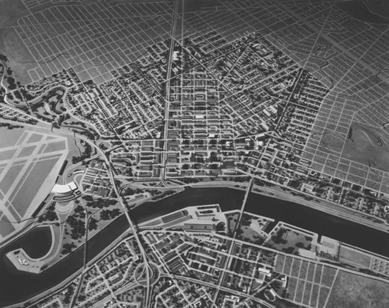 贝尔·盖德斯对托莱多的未来愿景包括一个整合铁路、公路和机场的市中心交通枢纽。照片由托莱多-卢卡斯县公共图书馆提供,获取自 http://images2.toledolibrary.org/这样的信心曾是五大湖地区的通货。自内战以来,托莱多的人口一直稳步上升,“铁路与水道交汇之城”成为工业中心,拥有繁荣的玻璃厂和汽车制造厂。移民、扩张和工业的混合激发了该市1913年的口号:“你将在托莱多过得更好。”但随着第二次世界大战的结束在望,托莱多的领导者们渴望吸引新一代居民和企业。《刀锋报》警告说,托莱多明天的信息是“那些未能为战后自身再生进行规划的城市注定要走向灭亡。”